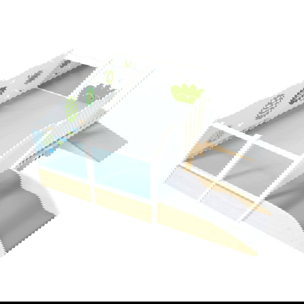 Der Einsatz von warmem Echtholz, kombiniert mit freundlichen Farbakzenten und dem rutschfesten tretford-Teppichbelag auf dem Podest, schafft eine behagliche Spielumgebung. Alle Oberflächen sind mit umweltschonendem Acryllack auf Wasserbasis behandelt, der speichelecht und gesundheitlich absolut unbedenklich ist.