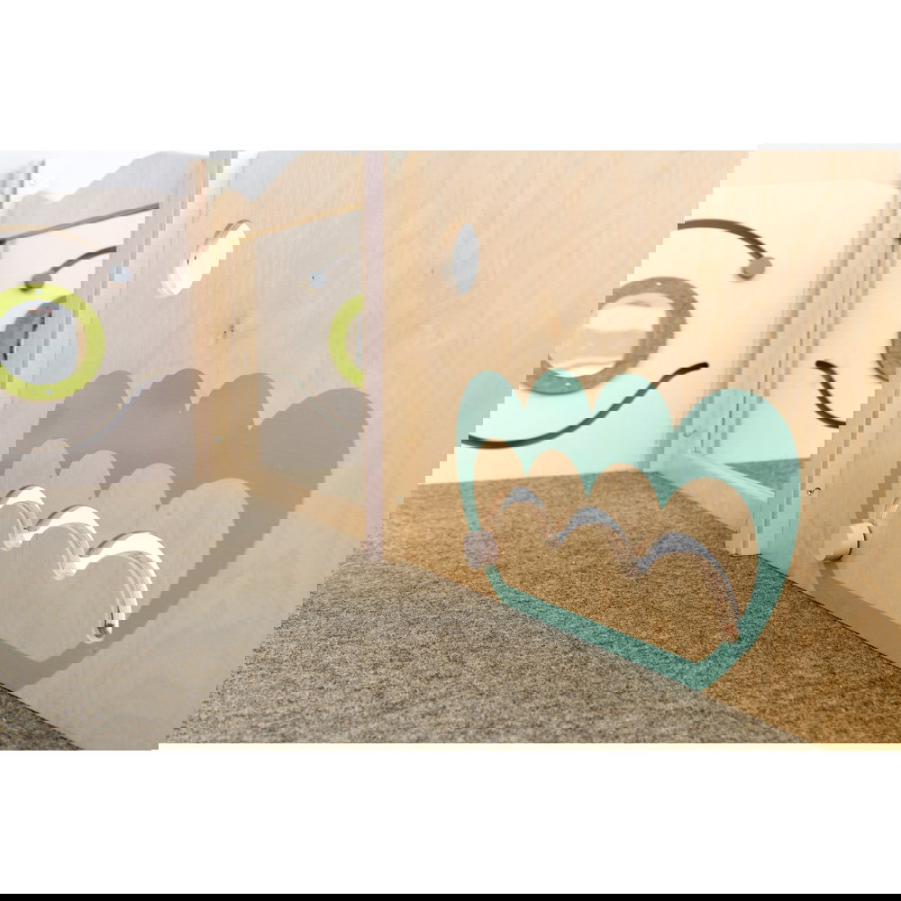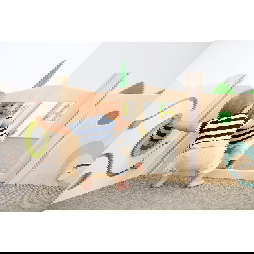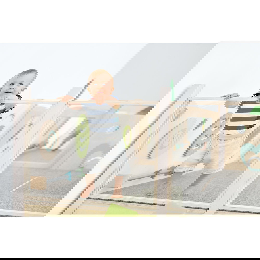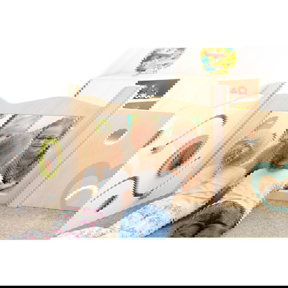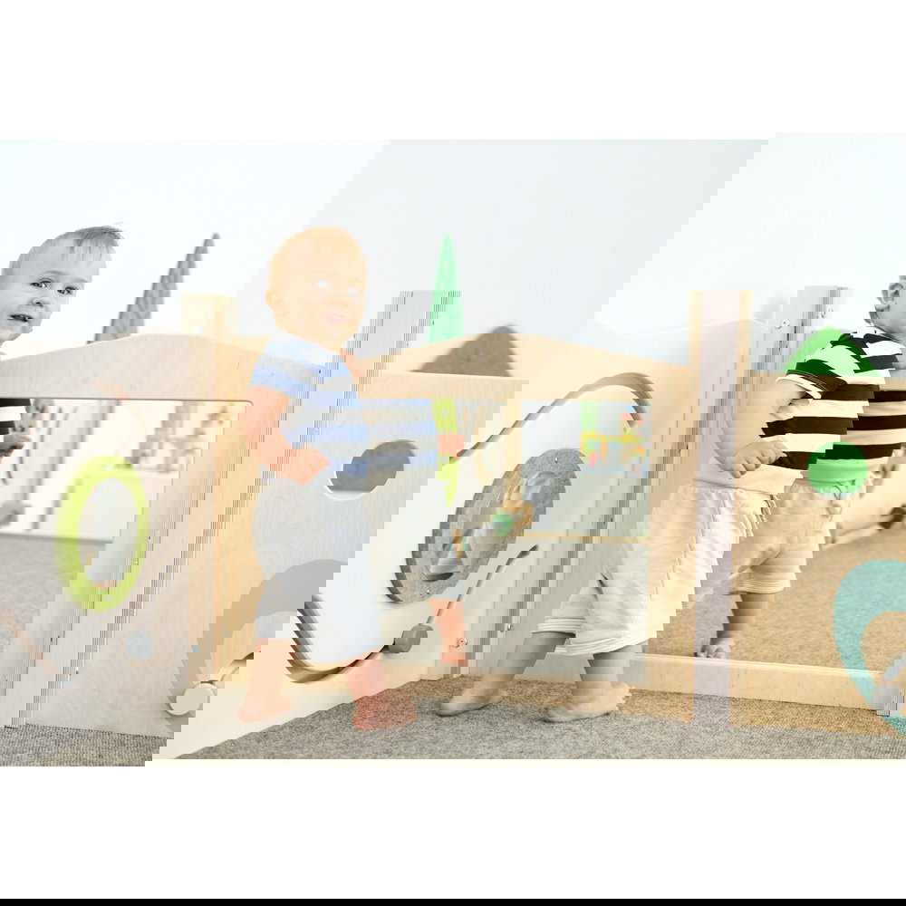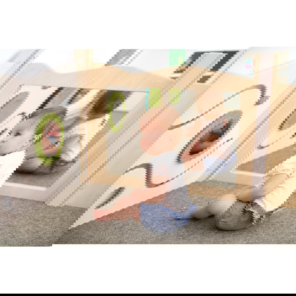 Diese Spielecke spricht alle Sinne an. Die Kombination aus taktilen Reizen (glatte Oberflächen, weicher Schaumstoff, robuster Teppich) und visuellen Elementen (Spiegel, Gucklöcher, Drehrad) unterstützt die kognitive Entwicklung. Die motorischen Herausforderungen beim Klettern und Krabbeln stärken zudem das Körpergefühl und die Koordination. - Sicheres Beobachten und Interagieren