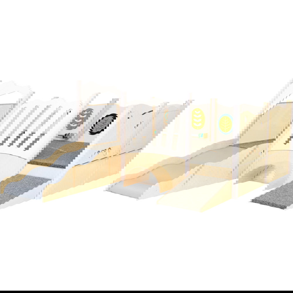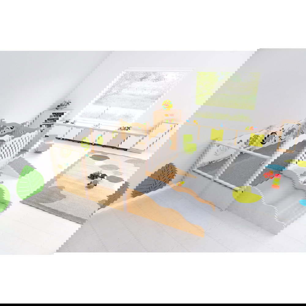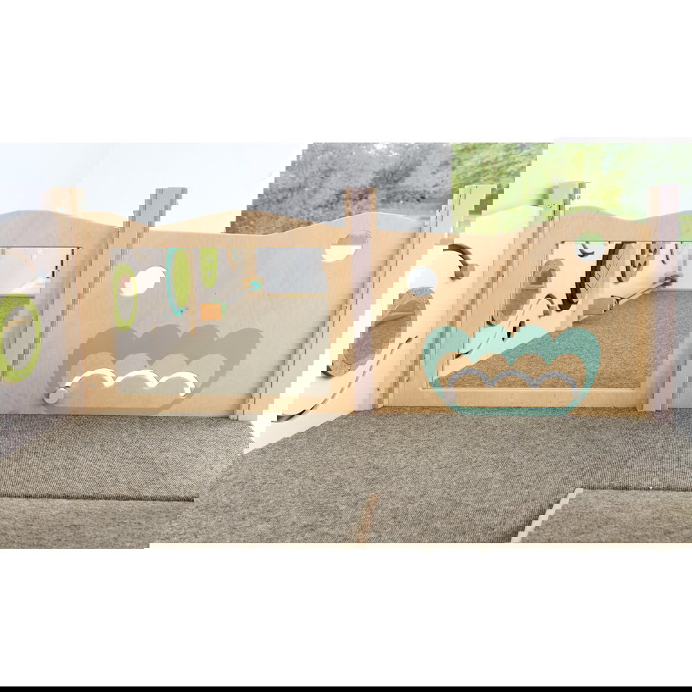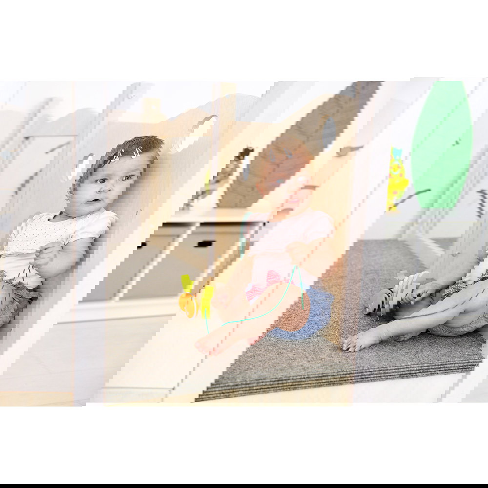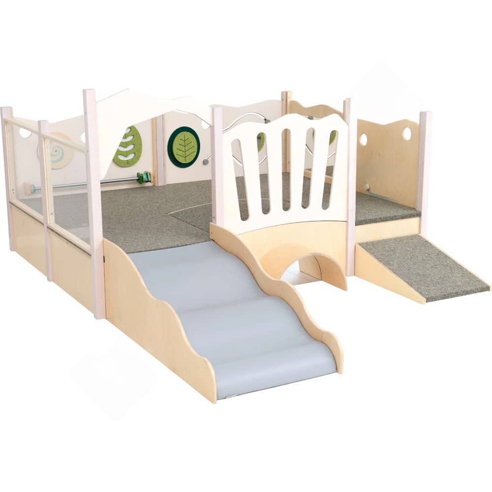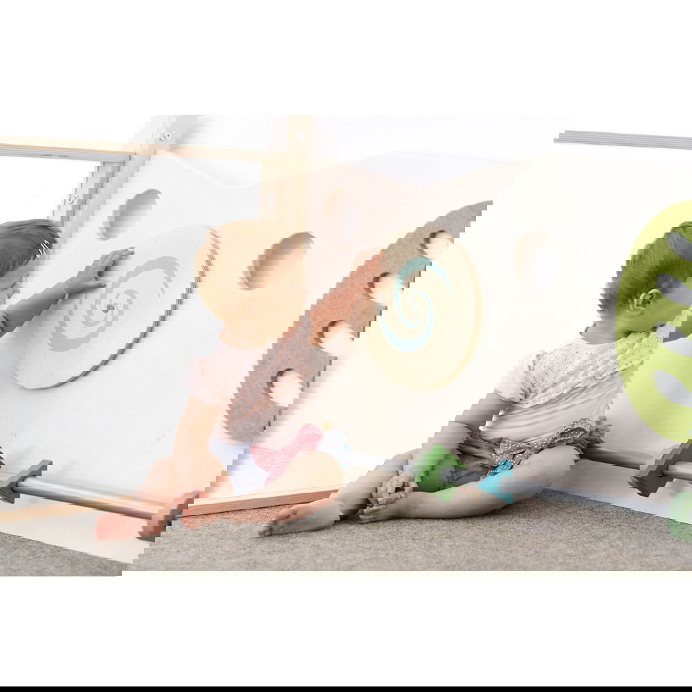 Diese Spielecke spricht alle Sinne an. Die Kombination aus taktilen Reizen (glatte Oberflächen, weicher Schaumstoff, robuster Teppich) und visuellen Elementen (Spiegel, Gucklöcher, Drehrad) unterstützt die kognitive Entwicklung. Die motorischen Herausforderungen beim Klettern und Krabbeln stärken zudem das Körpergefühl und die Koordination. - Sicheres Beobachten und Interagieren
