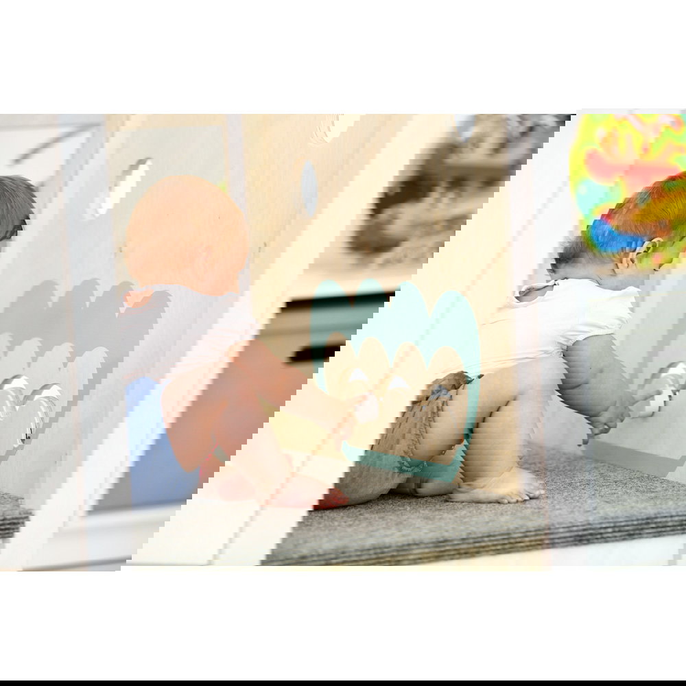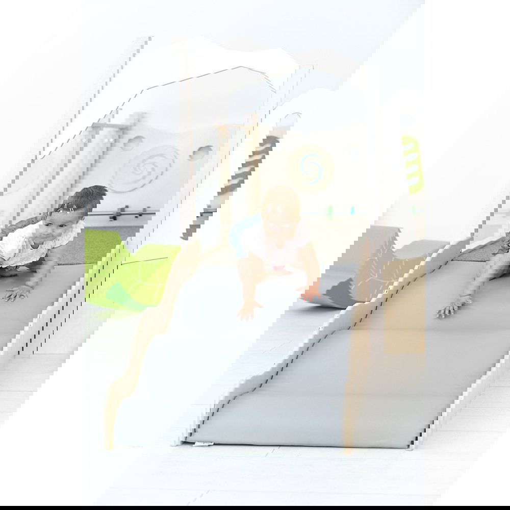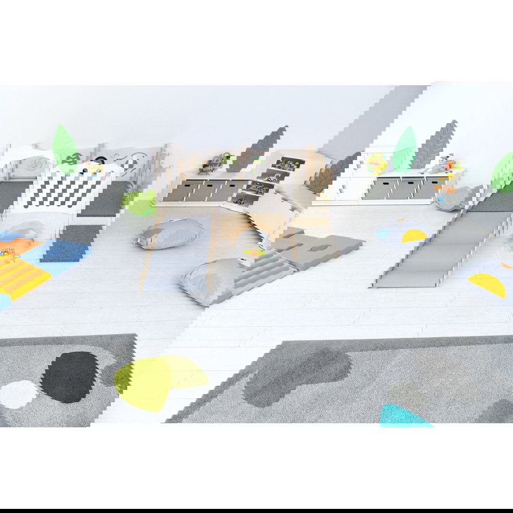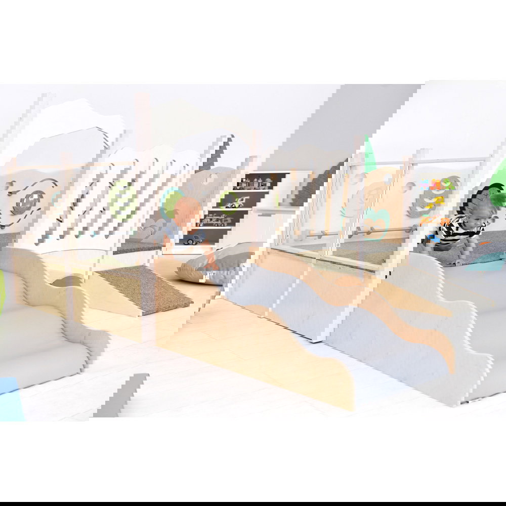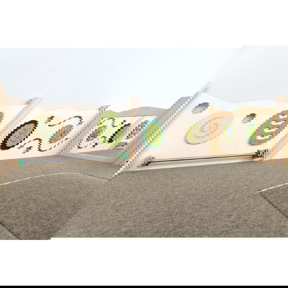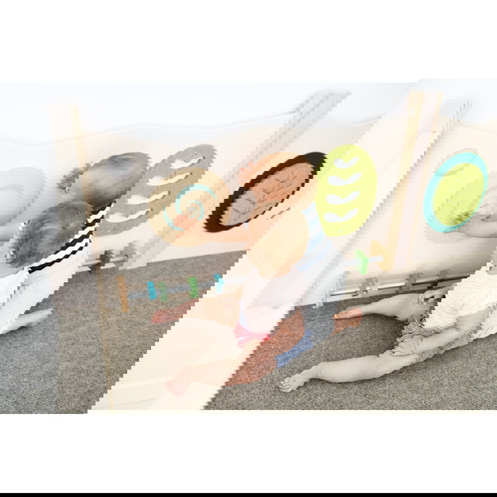 Diese Spielecke spricht alle Sinne an. Die Kombination aus taktilen Reizen (glatte Oberflächen, weicher Schaumstoff, robuster Teppich) und visuellen Elementen (Spiegel, Gucklöcher, Drehrad) unterstützt die kognitive Entwicklung. Die motorischen Herausforderungen beim Klettern und Krabbeln stärken zudem das Körpergefühl und die Koordination. - Sicheres Beobachten und Interagieren