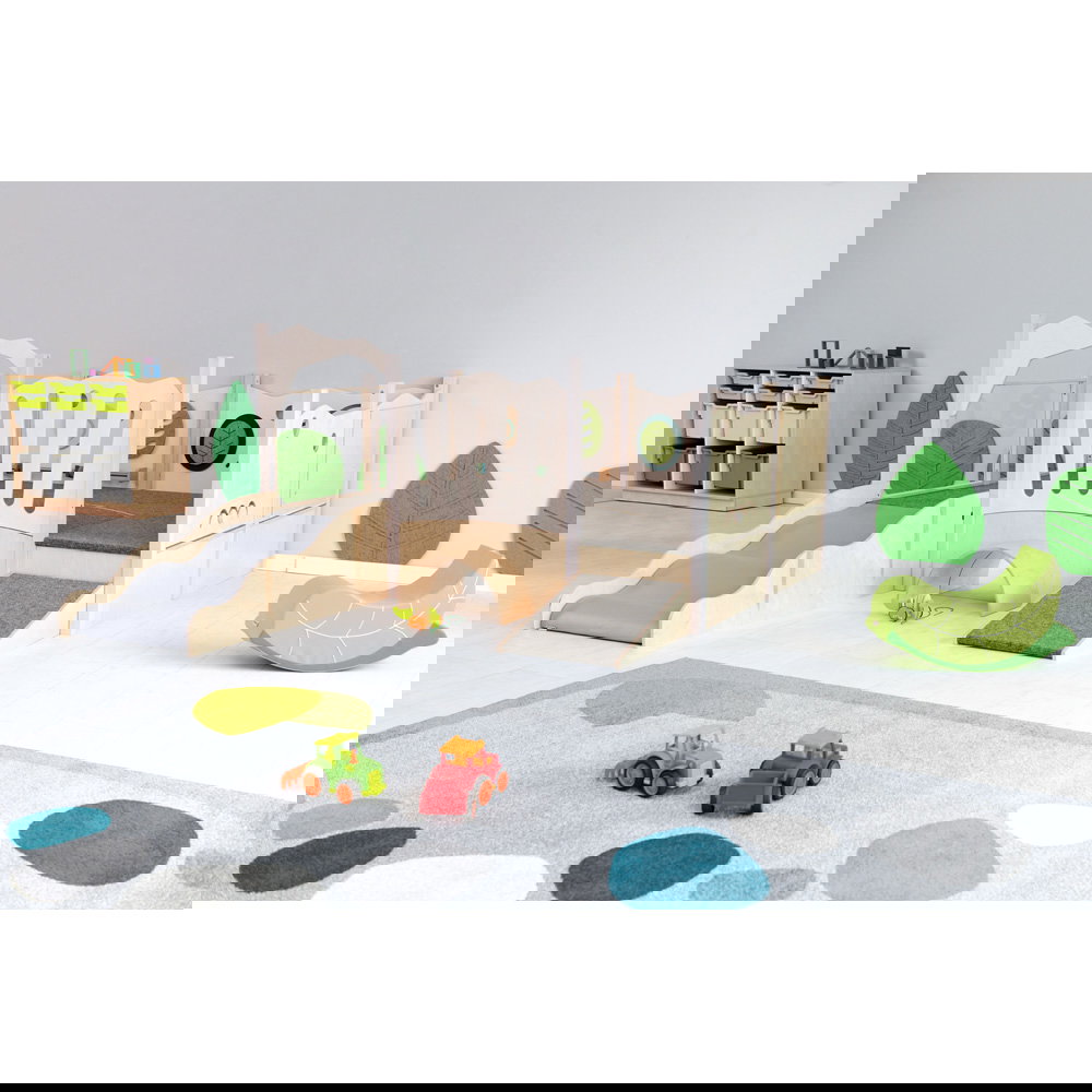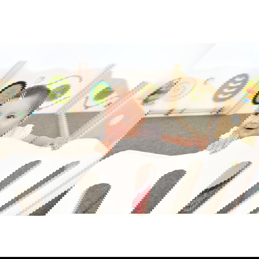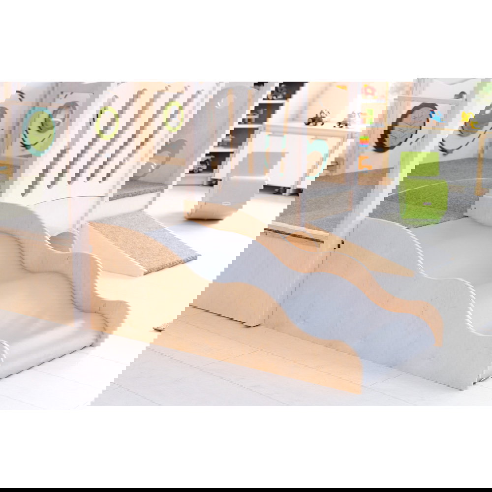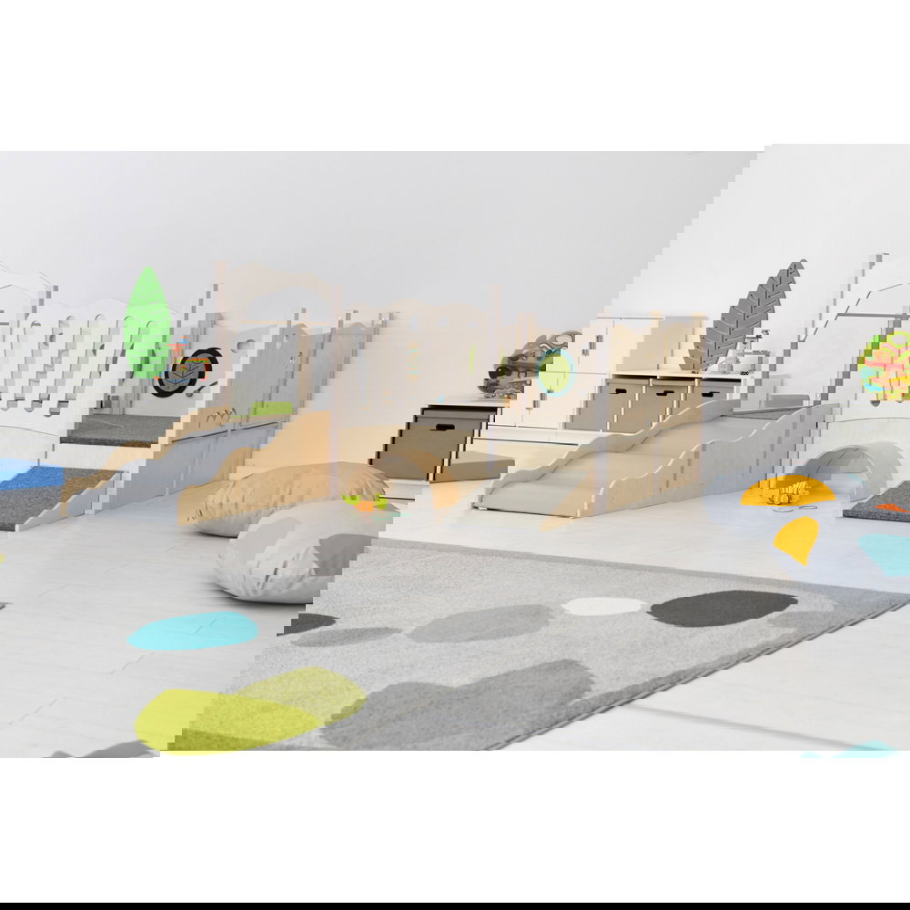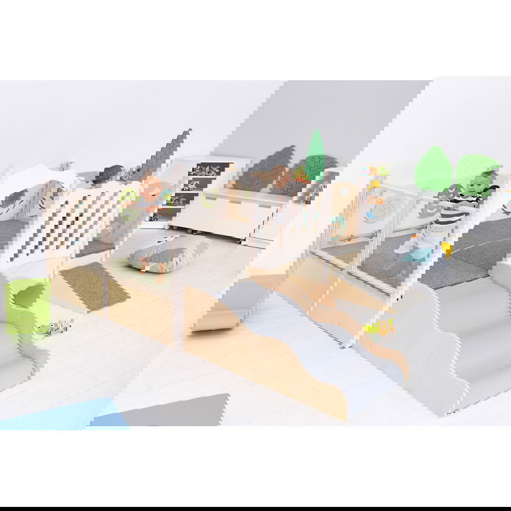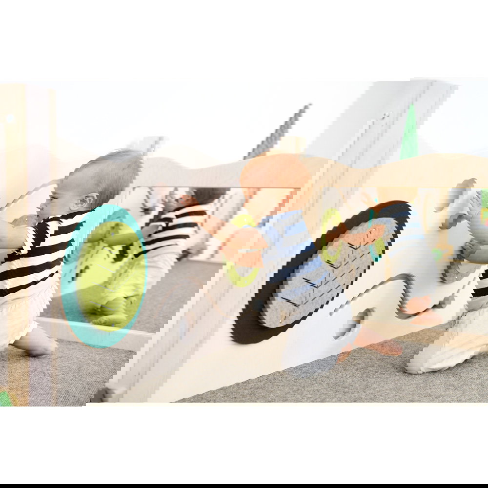 Diese Spielecke spricht alle Sinne an. Die Kombination aus taktilen Reizen (glatte Oberflächen, weicher Schaumstoff, robuster Teppich) und visuellen Elementen (Spiegel, Gucklöcher, Drehrad) unterstützt die kognitive Entwicklung. Die motorischen Herausforderungen beim Klettern und Krabbeln stärken zudem das Körpergefühl und die Koordination. - Sicheres Beobachten und Interagieren