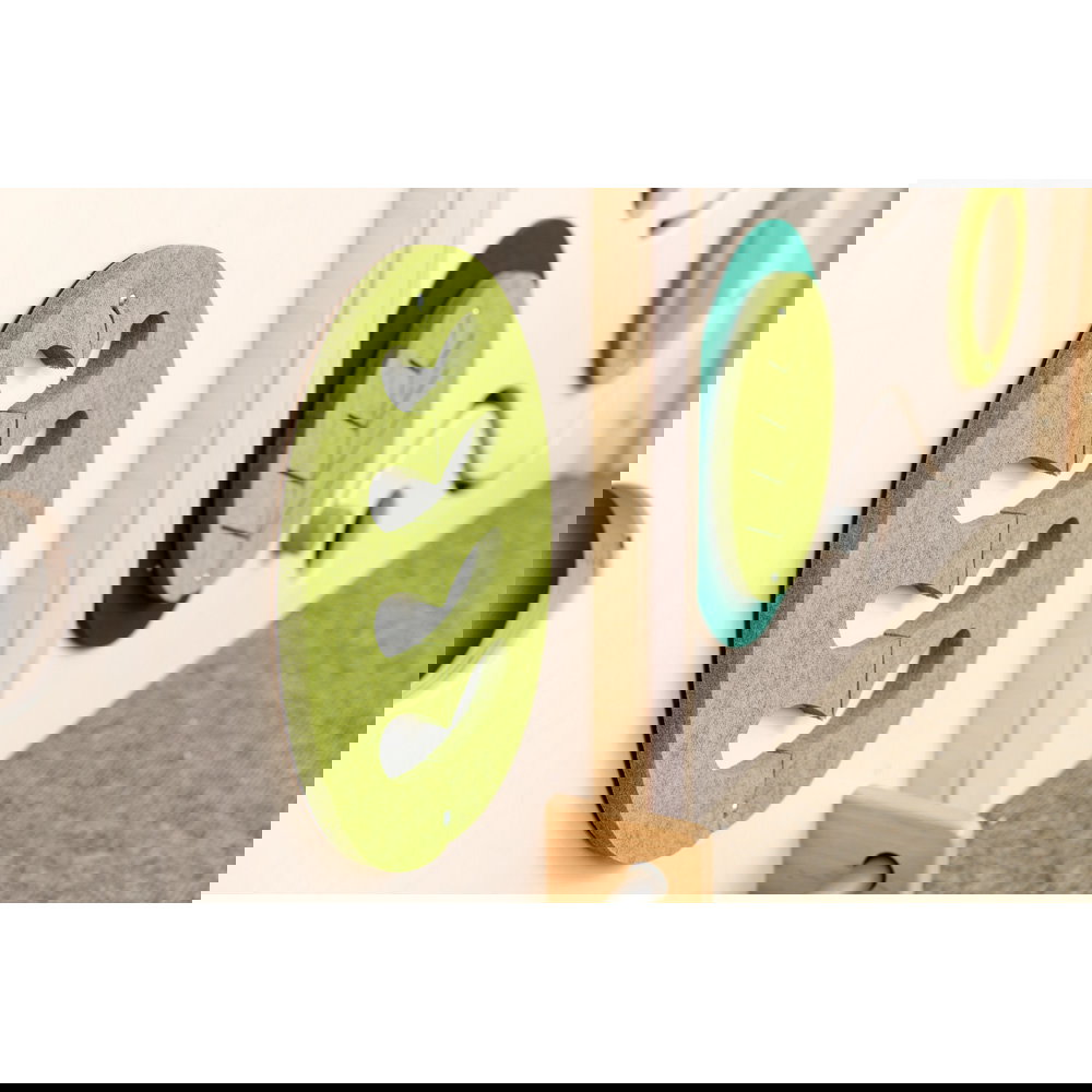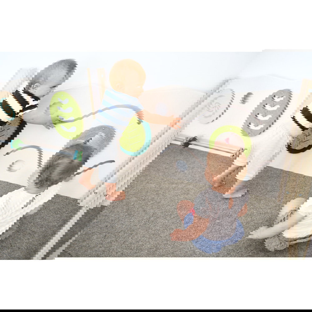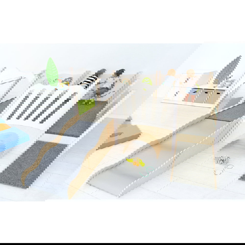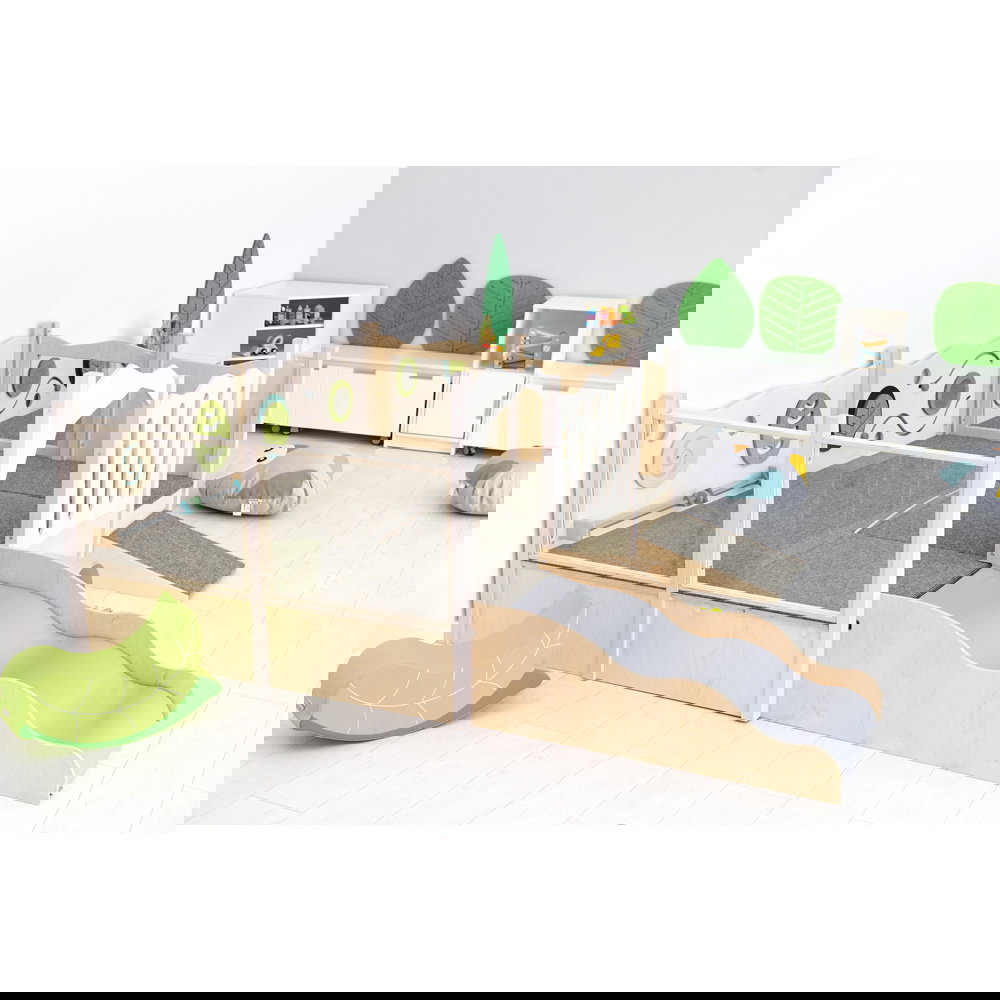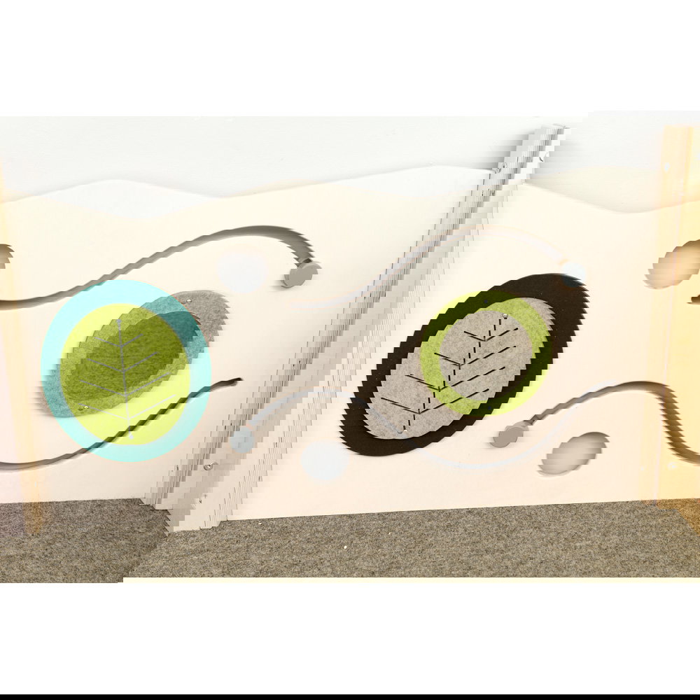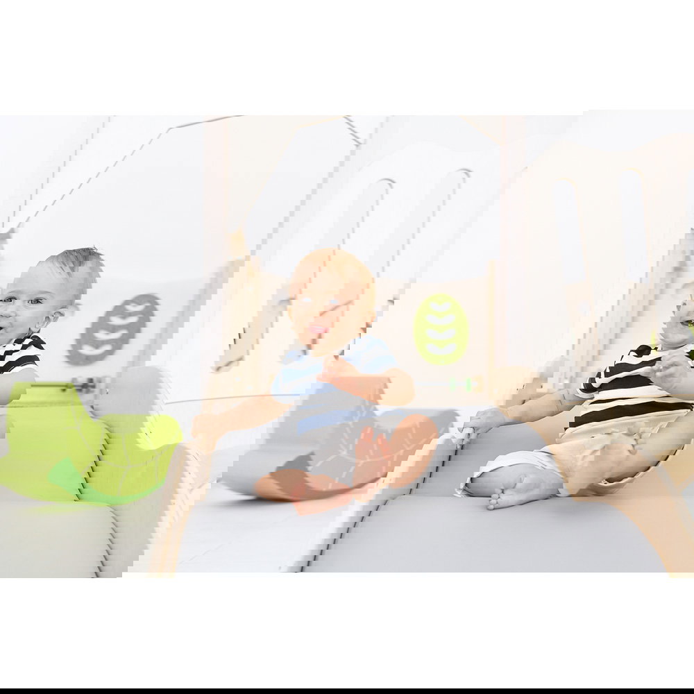 Diese Spielecke spricht alle Sinne an. Die Kombination aus taktilen Reizen (glatte Oberflächen, weicher Schaumstoff, robuster Teppich) und visuellen Elementen (Spiegel, Gucklöcher, Drehrad) unterstützt die kognitive Entwicklung. Die motorischen Herausforderungen beim Klettern und Krabbeln stärken zudem das Körpergefühl und die Koordination. - Sicheres Beobachten und Interagieren