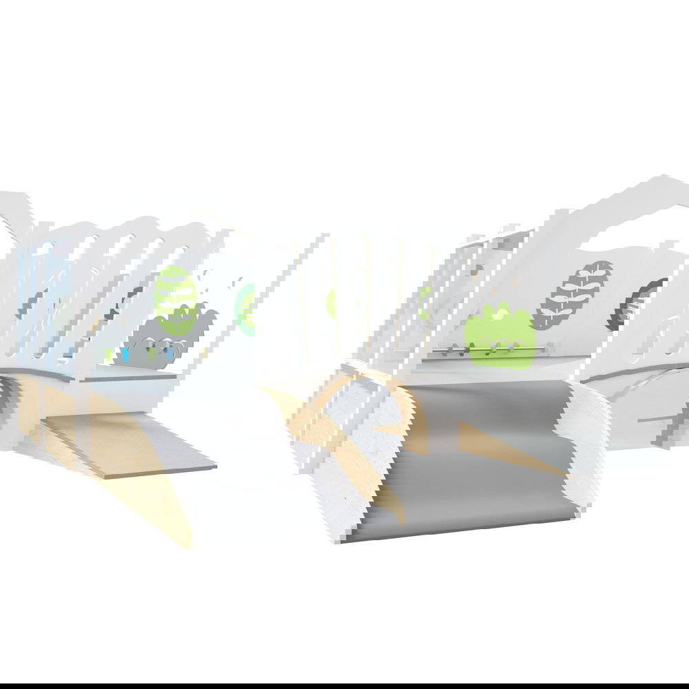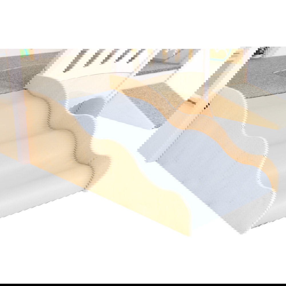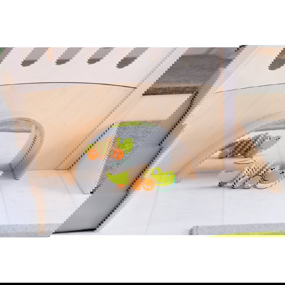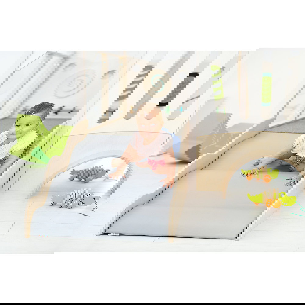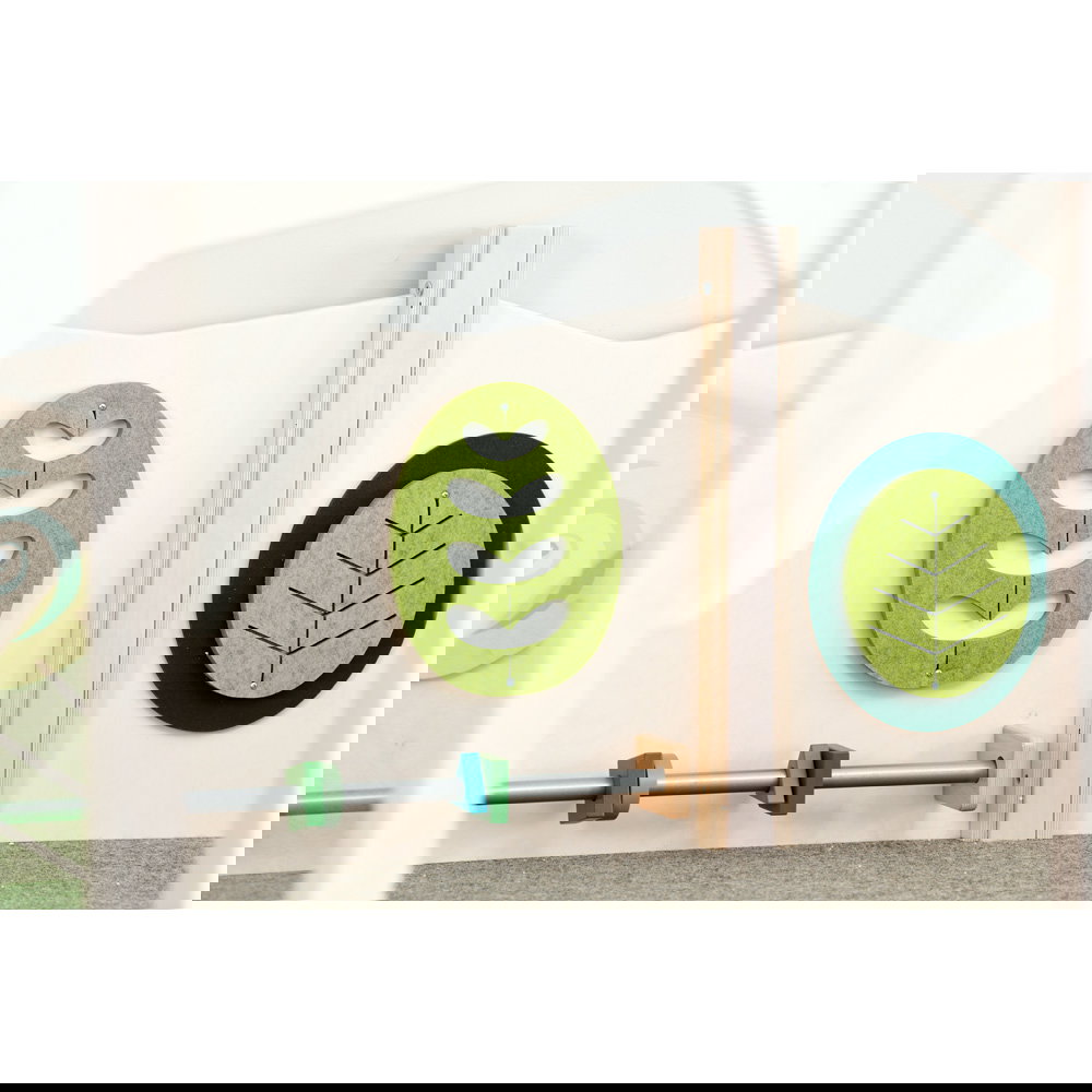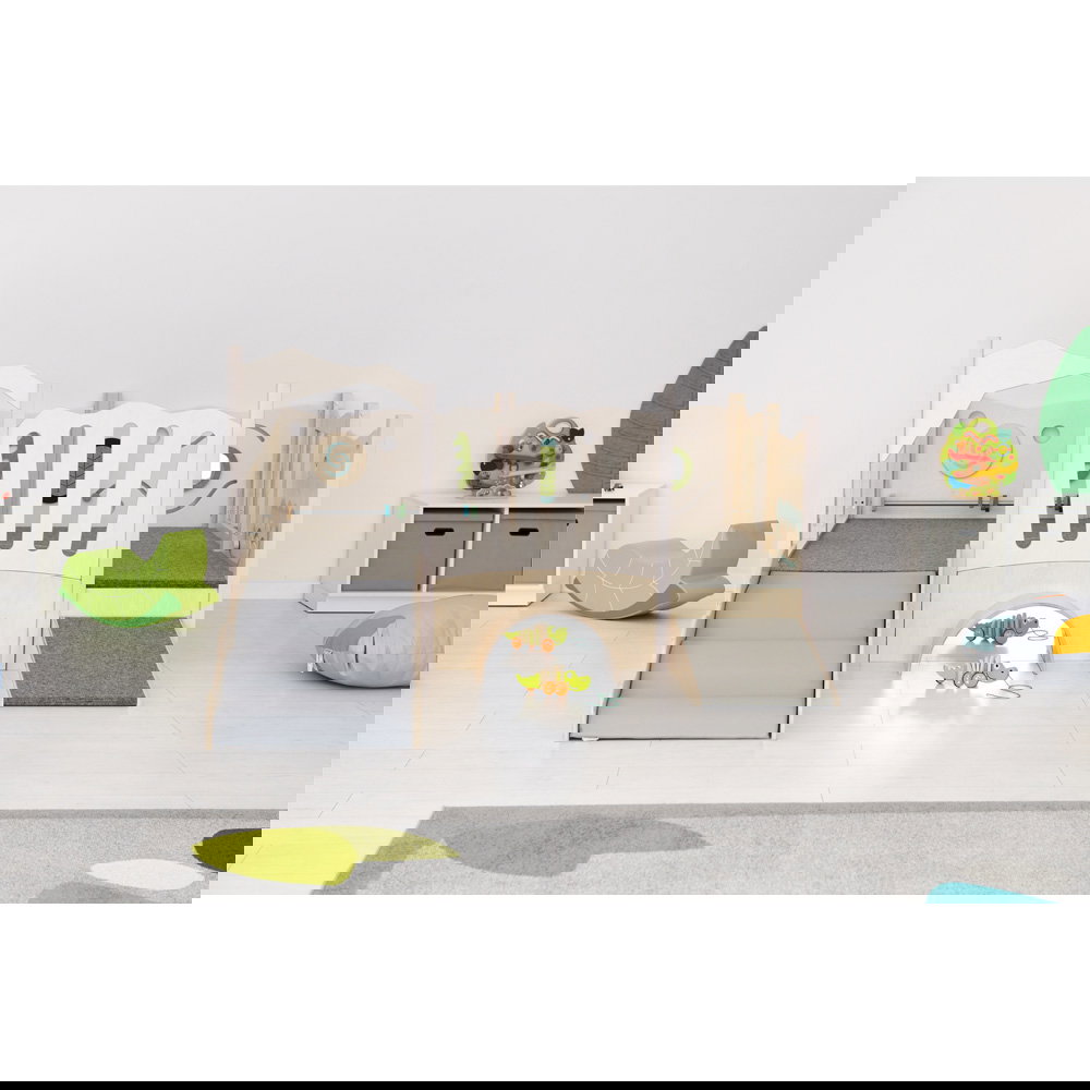 Diese Spielecke spricht alle Sinne an. Die Kombination aus taktilen Reizen (glatte Oberflächen, weicher Schaumstoff, robuster Teppich) und visuellen Elementen (Spiegel, Gucklöcher, Drehrad) unterstützt die kognitive Entwicklung. Die motorischen Herausforderungen beim Klettern und Krabbeln stärken zudem das Körpergefühl und die Koordination. - Sicheres Beobachten und Interagieren
