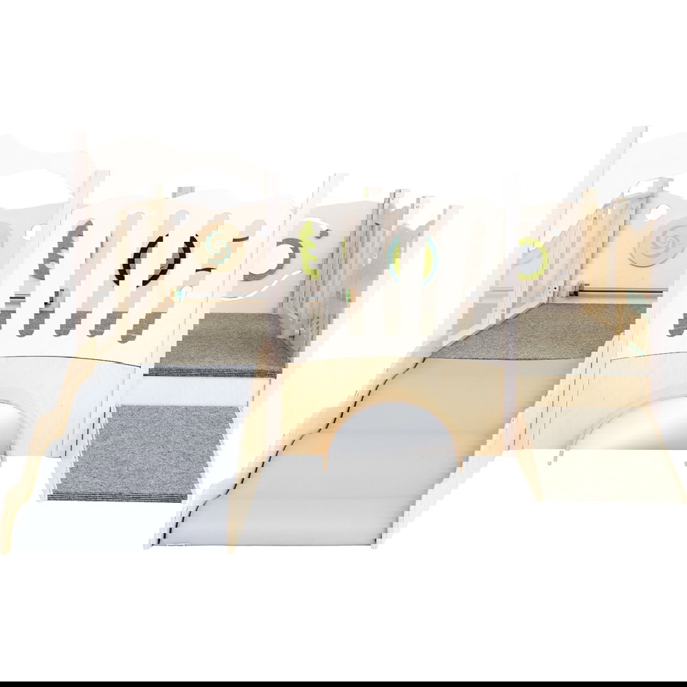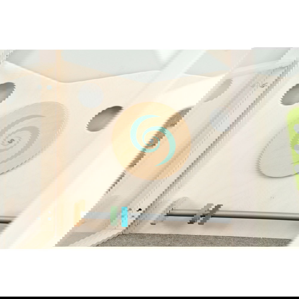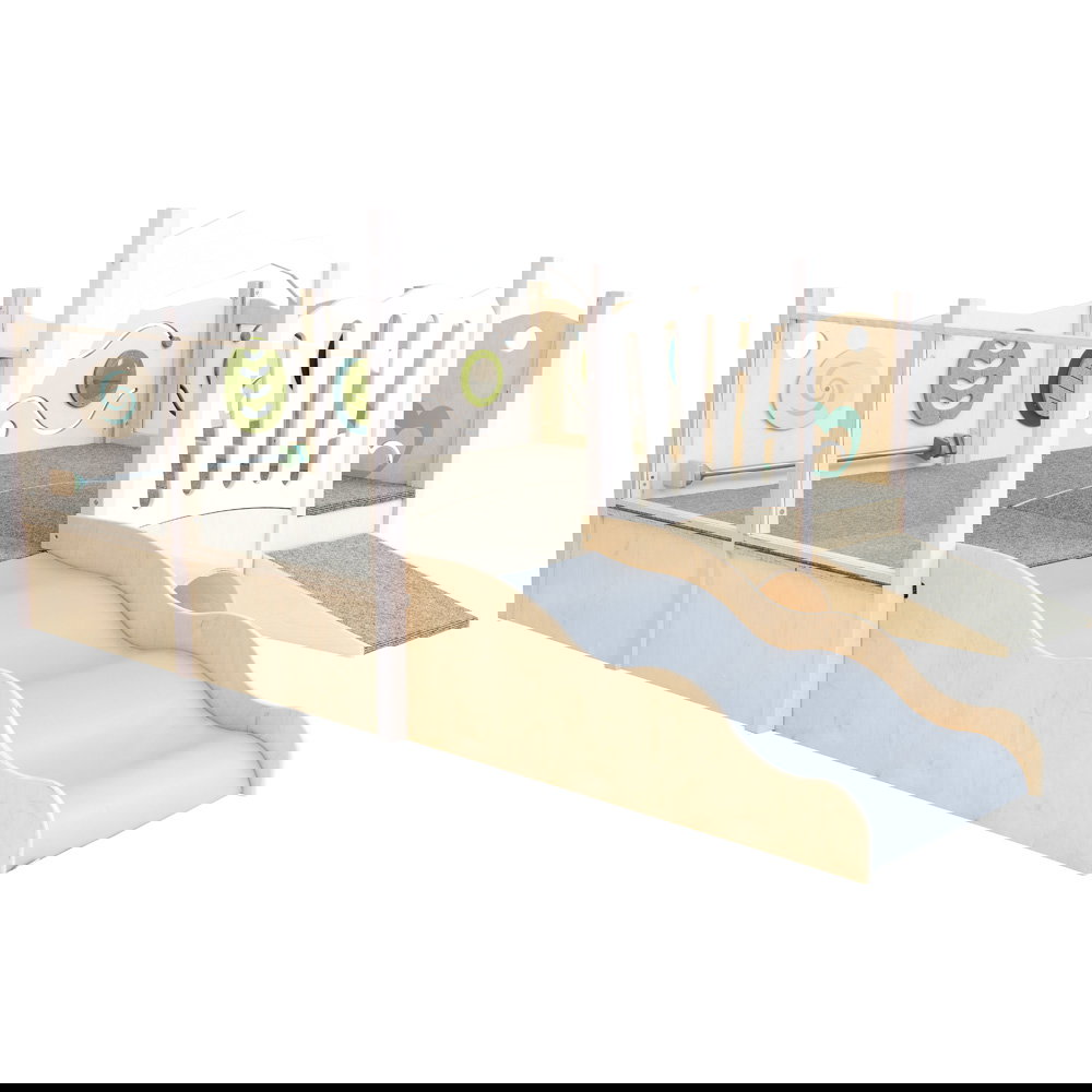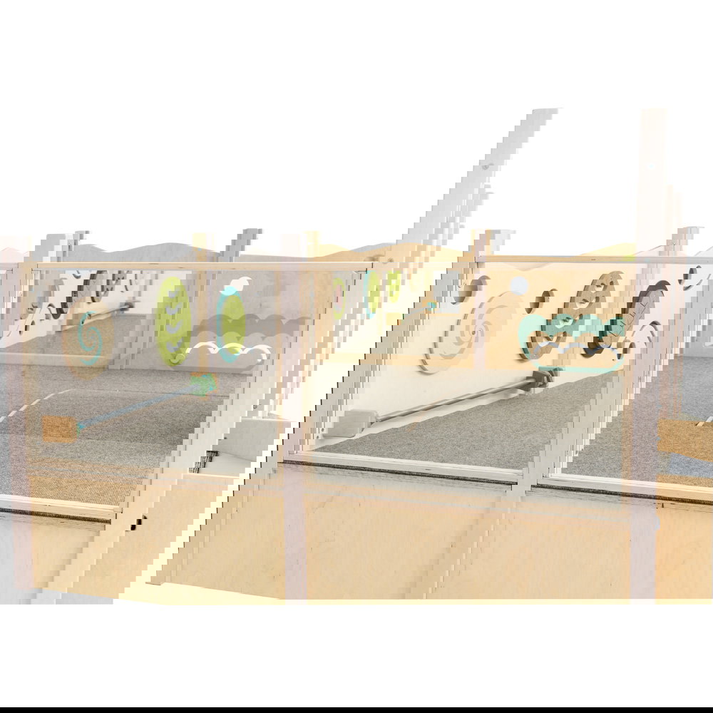 Der Zugang zur Spielebene ist abwechslungsreich gestaltet: Ob über die sanfte Rampe mit rutschfestem Teppich oder den weichen Wellenaufgang – hier findet jedes Kind seinen eigenen Weg nach oben. Einmal angekommen, warten an den Wänden zahlreiche sensorische Überraschungen. Schiebespiele fordern die kleinen Finger heraus, ein drehbares Wirbelrad fasziniert das Auge, und der spannende Zerrspiegel sorgt für lachende Gesichter bei der Selbstwahrnehmung. Dank der transparenten Acrylglas-Wände bleiben die kleinen Entdecker immer in Kontakt mit ihrer Umgebung, während Erzieherinnen und Erzieher das Geschehen jederzeit entspannt im Blick behalten können.