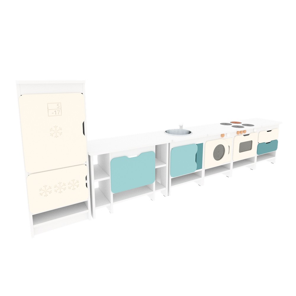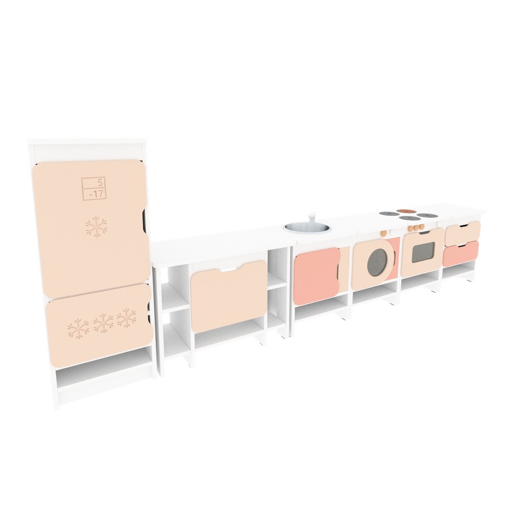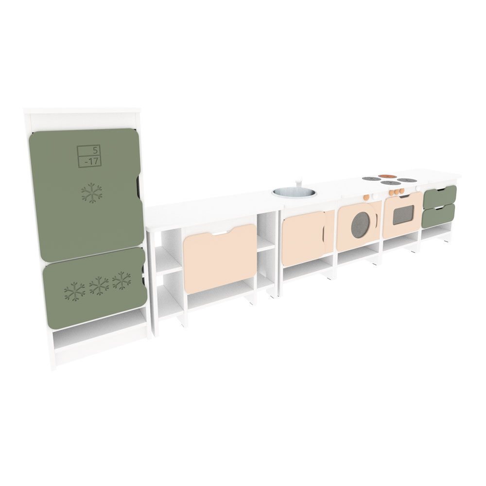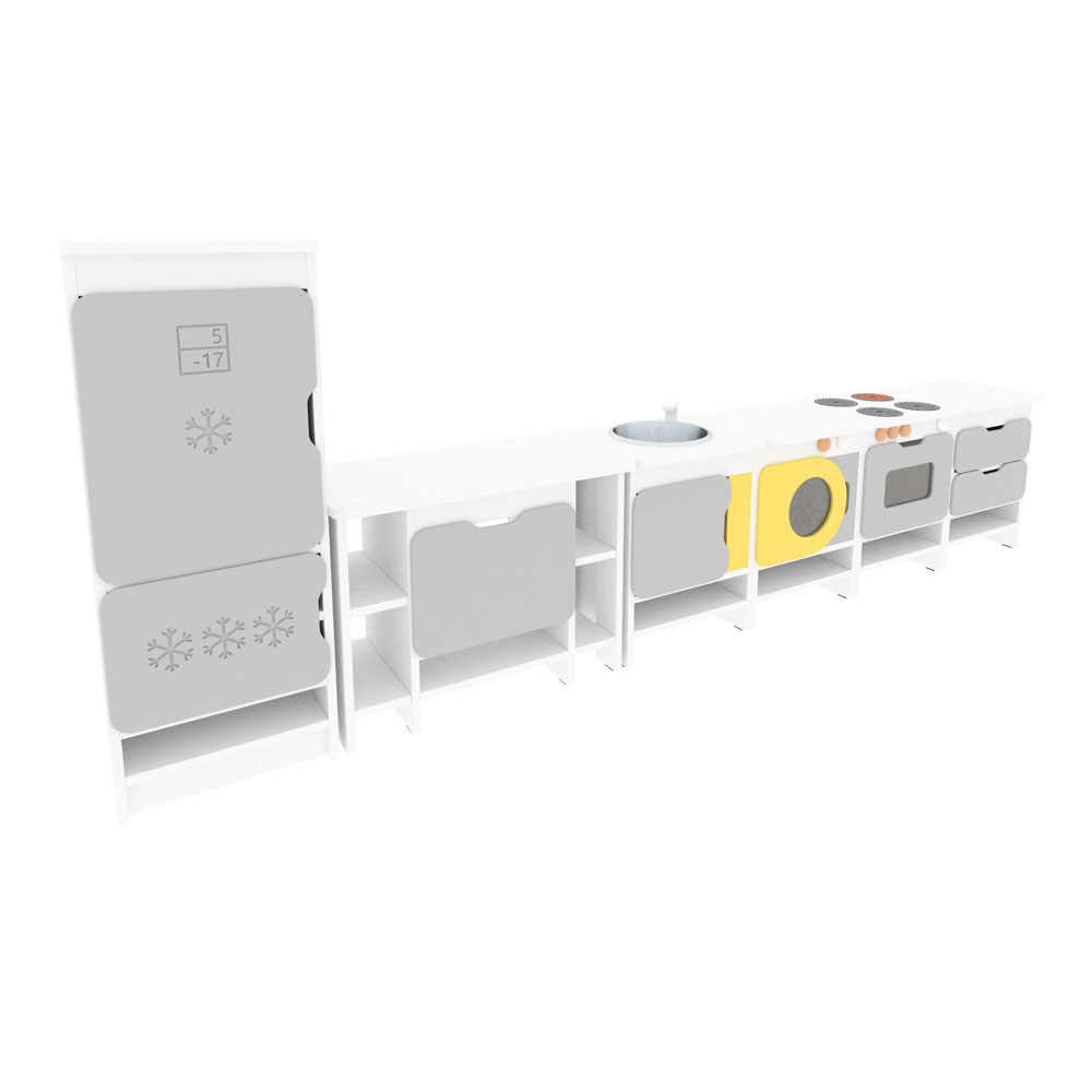 Die Spielküche besteht aus sechs einzelnen Modulen, die zusammen eine beeindruckende, 2,63 Meter breite Küchenzeile bilden. Zum Set gehören ein Kühlschrank, eine Spüle, eine Waschmaschine, ein Herd, ein praktischer Schubladenschrank und ein geräumiger Regalschrank. Jedes Element ist so gestaltet, dass es die Fantasie anregt und realistische Spielszenarien ermöglicht. Die detailgetreuen Designs, wie die aufgedruckten Herdplatten oder die Drehknebel, verstärken das authentische Spielgefühl. Dank der durchdachten Aufteilung finden alle wichtigen Küchenutensilien ihren Platz, was gleichzeitig das Ordnungsverständnis der Kinder schult.