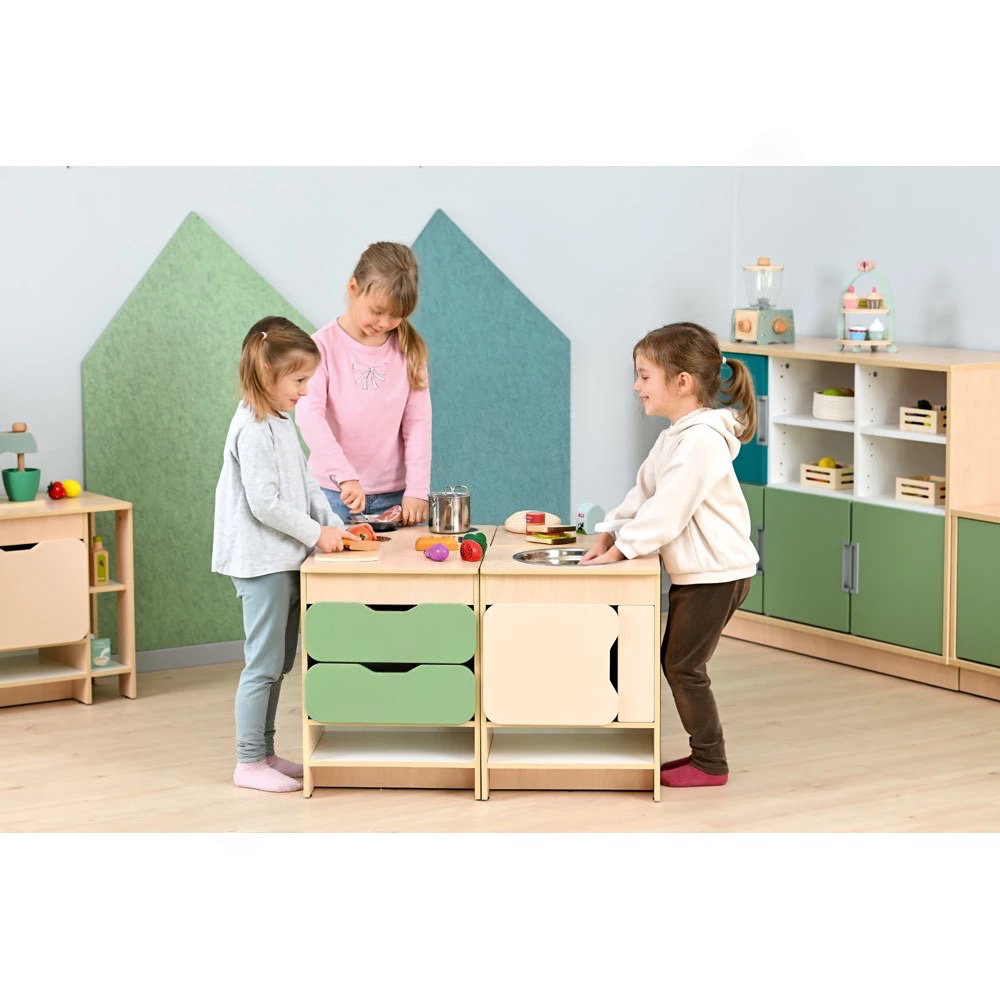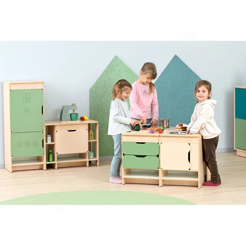 Bei der Konzeption der Quadro Küche wurde höchster Wert auf Langlebigkeit und Sicherheit gelegt. Der Korpus der Möbel besteht aus einer robusten, 12 mm starken laminierten Spanplatte. Die Fronten sind aus einer hochwertig folierten MDF-Platte gefertigt, die den täglichen Beanspruchungen im Spielalltag problemlos standhält. Die harmonische Kombination aus dem warmen Ahorn-Dekor des Korpus und den farbenfrohen Fronten schafft eine einladende und freundliche Atmosphäre. Die Höhe und Tiefe der Möbel sind optimal auf die Größe von Kindern abgestimmt, sodass ein ergonomisches und sicheres Spielen jederzeit gewährleistet ist.