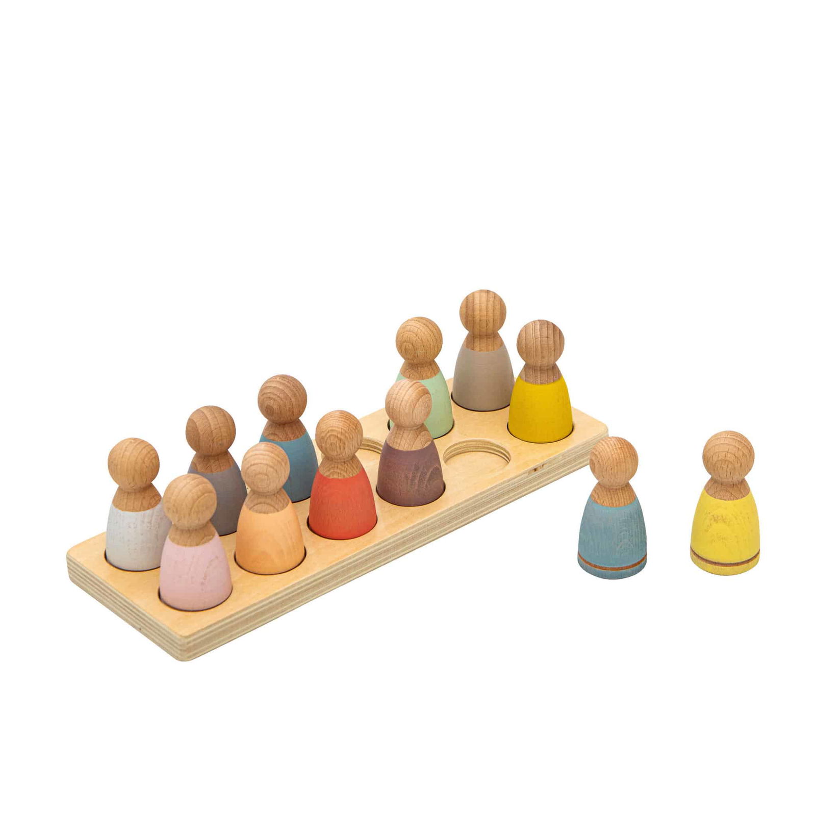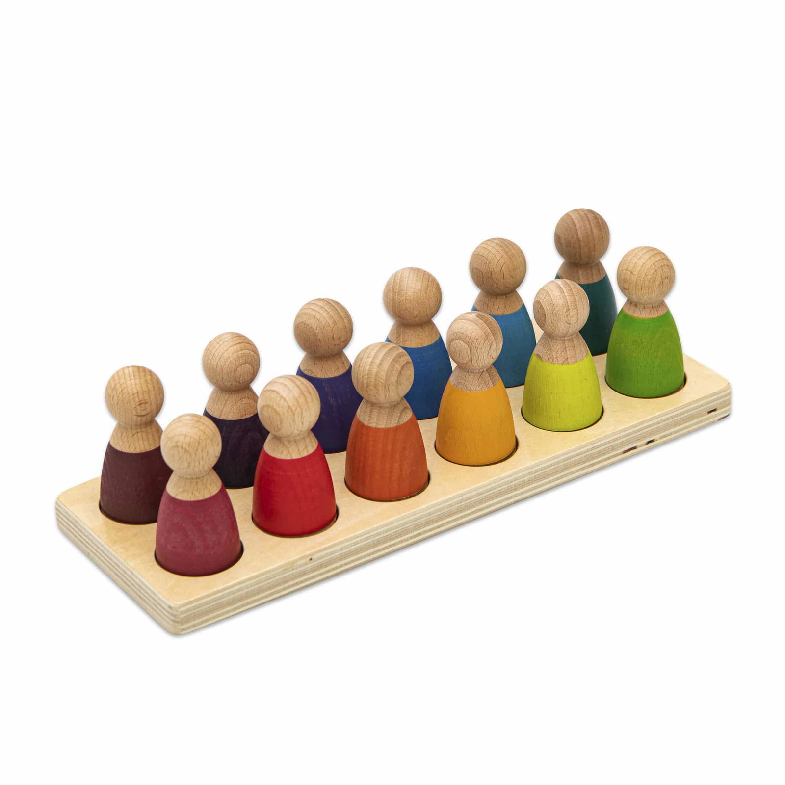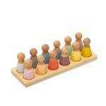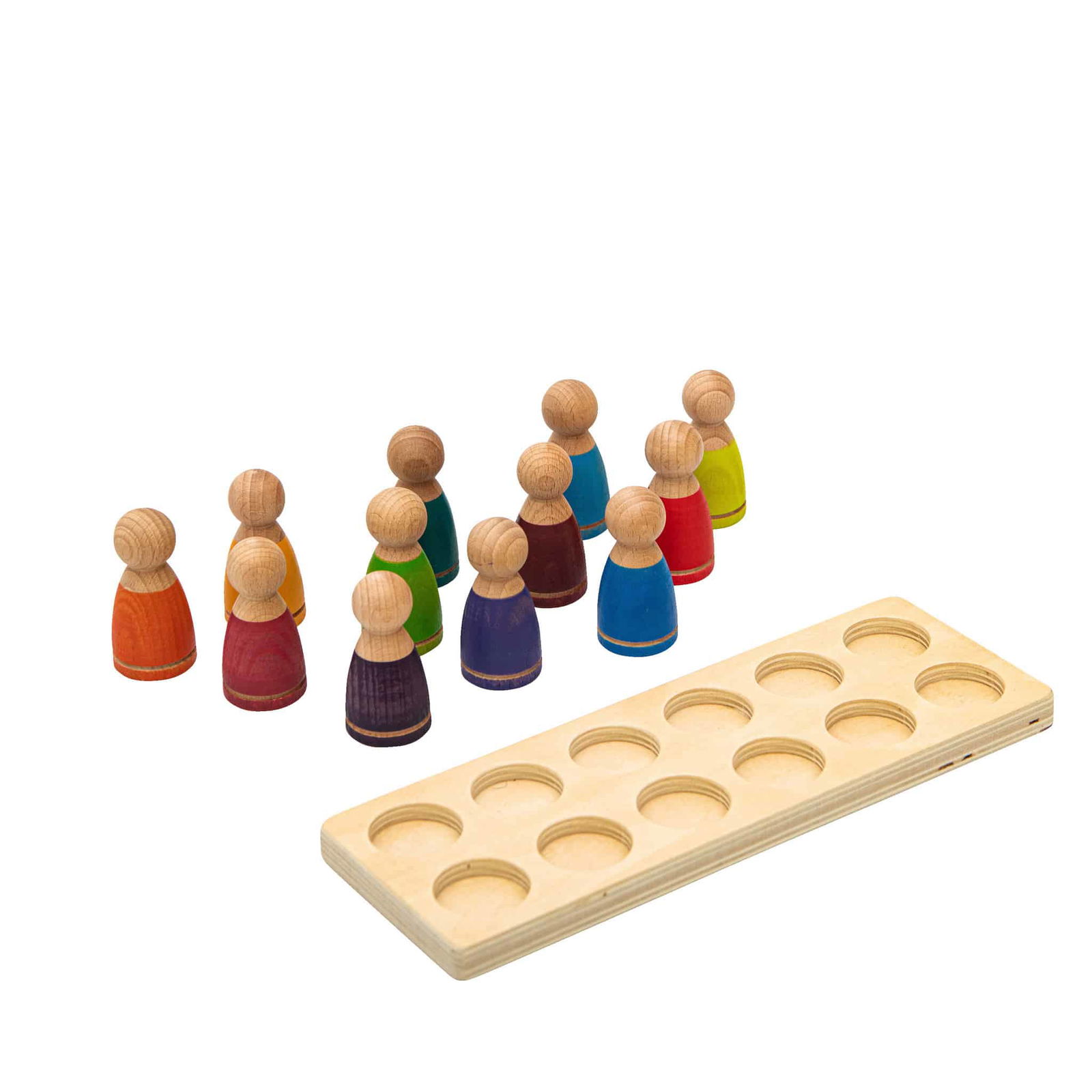 - Lieferumfang: 1 Holzleiste mit 12 farbigen Figuren