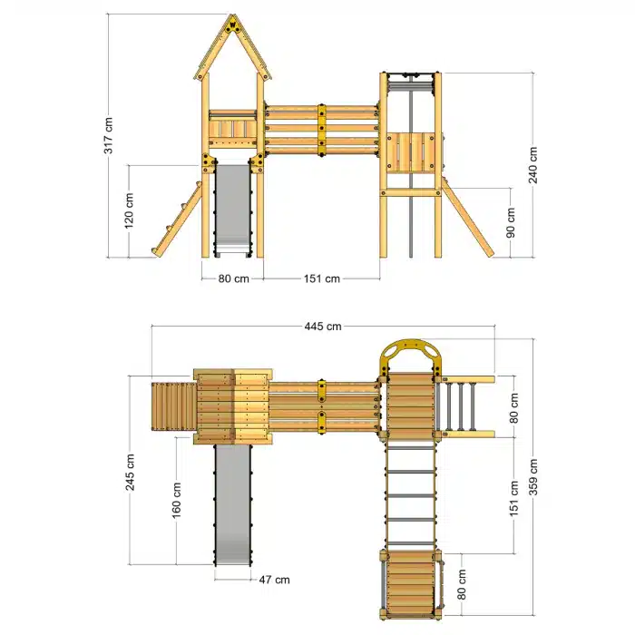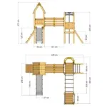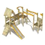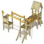 - Die schräge Kletterleiter mit Edelstahlsprossen und die Hangelleiter aus HDPE bieten zusätzliche Herausforderungen und stärken die Muskulatur.