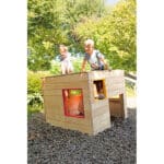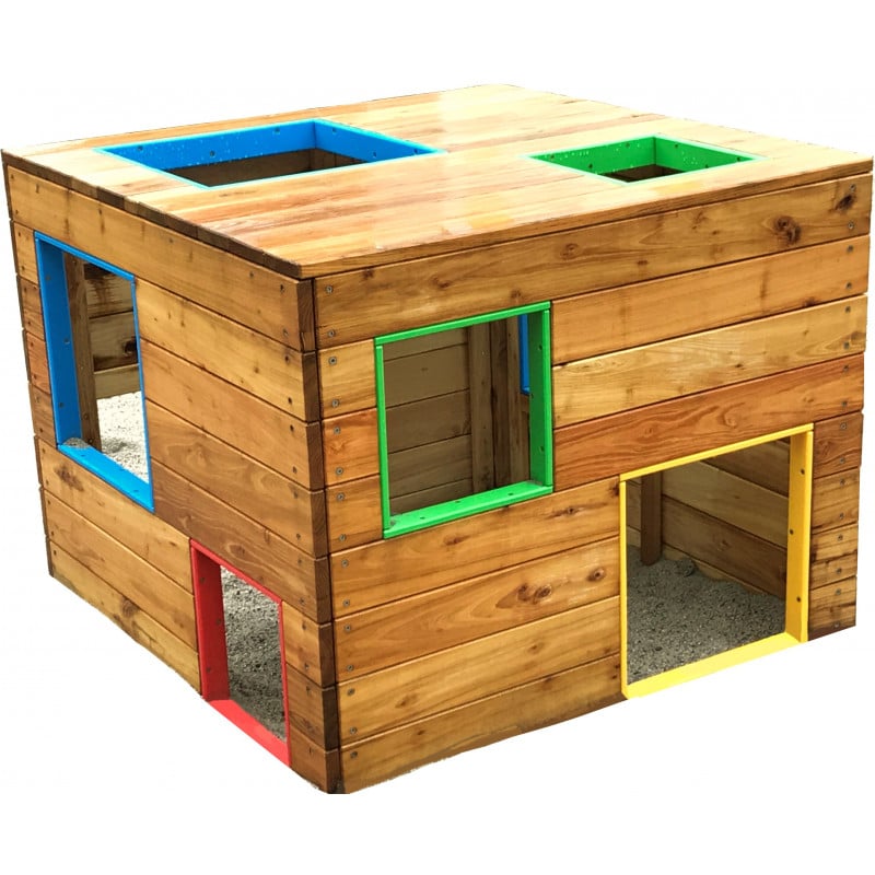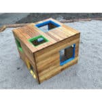 Spielhaus „Würfel“ – „Quadratisch – bunt – schräg“: Der Spiel-Würfel zieht Kinder magisch an. Die einen krabbeln durch die bodennahen Öffnungen rein und raus, während die anderen über die Fenster auf das „Dach“ steigen und dort den Ausblick genießen. Der Würfel ist also Spielhaus und Klettergerät in einem. Durch die Verwendung von Robinienholz ist er außerdem äußerst stabil und belastbar.