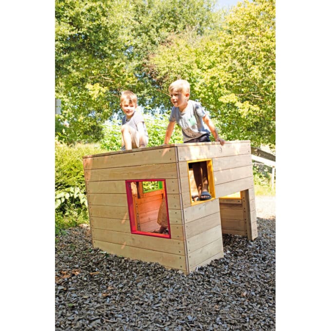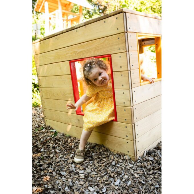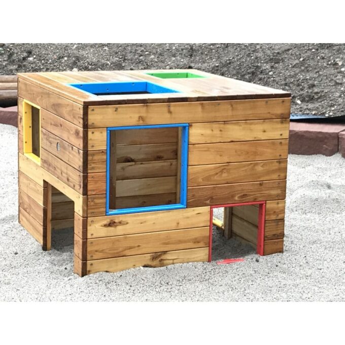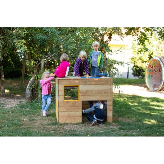 Spielhaus „Würfel“ – „Quadratisch – bunt – schräg“: Der Spiel-Würfel zieht Kinder magisch an. Die einen krabbeln durch die bodennahen Öffnungen rein und raus, während die anderen über die Fenster auf das „Dach“ steigen und dort den Ausblick genießen. Der Würfel ist also Spielhaus und Klettergerät in einem. Durch die Verwendung von Robinienholz ist er außerdem äußerst stabil und belastbar.