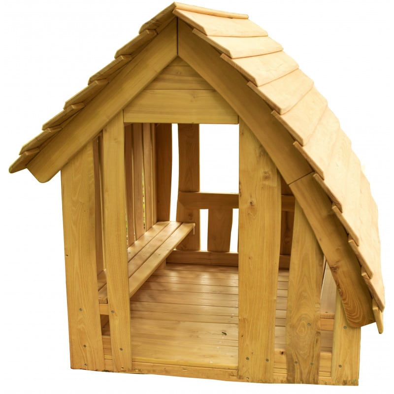 Spielhaus aus Robinien-Holz – Waldhütte: „Ganz schön urig“ Das kleine Häuschen ist zugleich Hütte, Sandspielhaus und Rückzugsecke – ideal für Spielräume mit wenig Platz und für kleinere Gruppen. Die geschwungenen Robinienholzbretter verleihen der Waldhütte das urig-gemütliche Aussehen. Durch die bereits vormontierten Einzelelemente ist es leicht aufzubauen. Auf beliebigem, standfesten Untergrund.