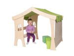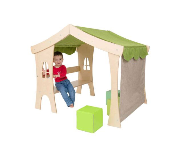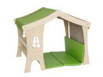 Elfenhaus aus 15 mm dickem Birkensperrholz, Dach und Seitenwand aus Polyestergewebe Tornado in den Farben Grün und Beige. Sitzmatte 4641660 für Elven House separat erhältlich.
