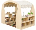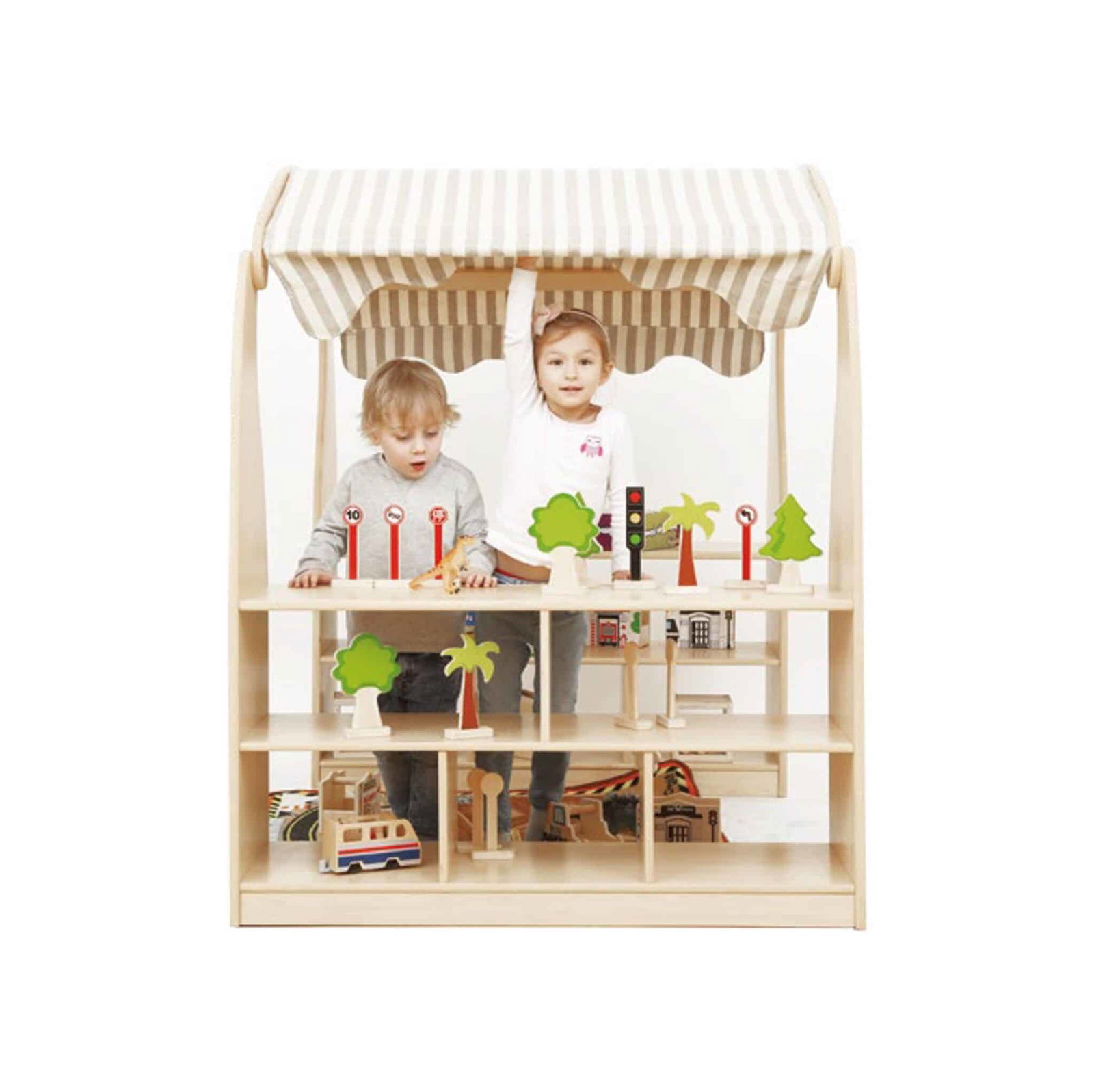 Gefertigt aus hochwertigem Pappel-Multiplex mit strapazierfähiger Melaminbeschichtung, ist dieses Spielhaus äußerst stabil und langlebig. Das Dach besteht aus einem widerstandsfähigen Stoffmix aus Leinen, Baumwolle und Ramie, der nicht nur dekorativ wirkt, sondern auch für eine einladende, gemütliche Optik sorgt. Dank der offenen Struktur behalten Erziehende stets den Überblick, während Kinder intuitiv auf Entdeckungsreise gehen können.