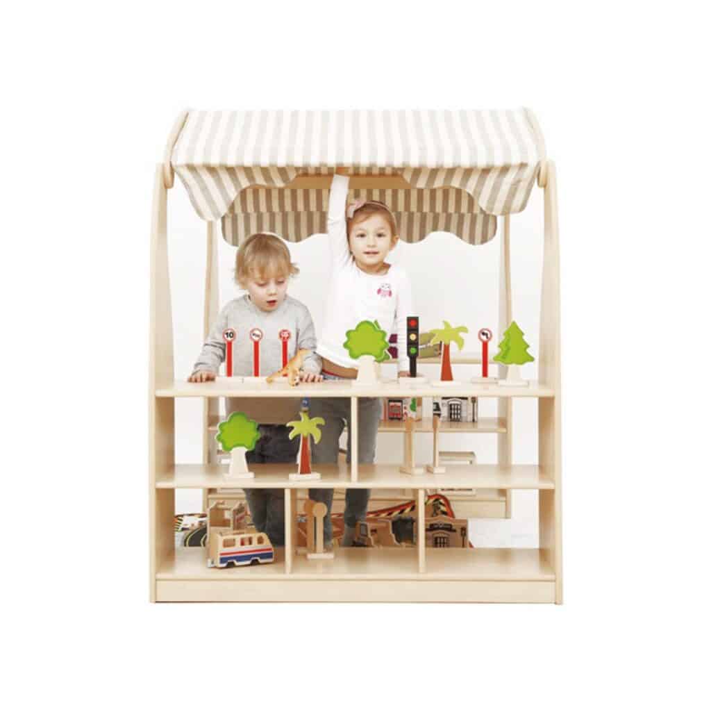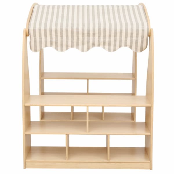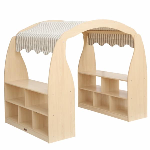 Die neutrale, helle Gestaltung in Ahorn-Optik schafft eine warme Atmosphäre und fügt sich harmonisch in jede pädagogische Umgebung ein. Gleichzeitig lässt das bewusst schlichte Design genügend Freiraum für individuelle Dekorationen und kreative Themenwelten: ob Supermarkt, Marktstand, Bäckerei oder Spielhaus – alles ist möglich.