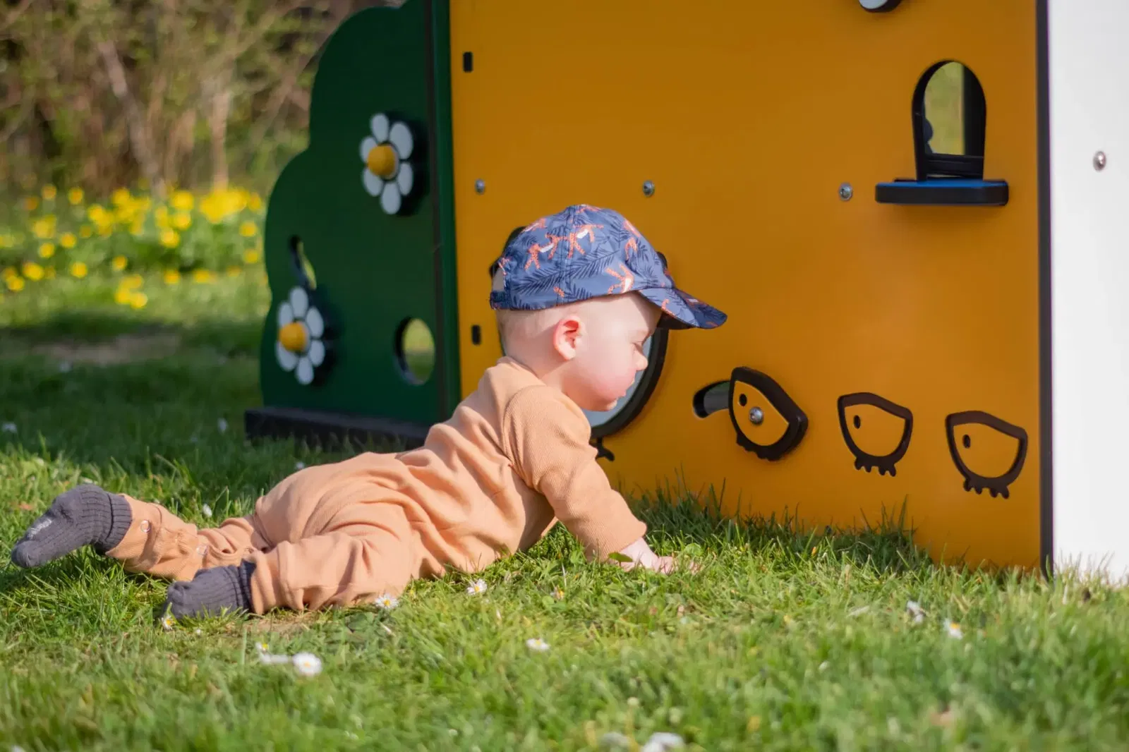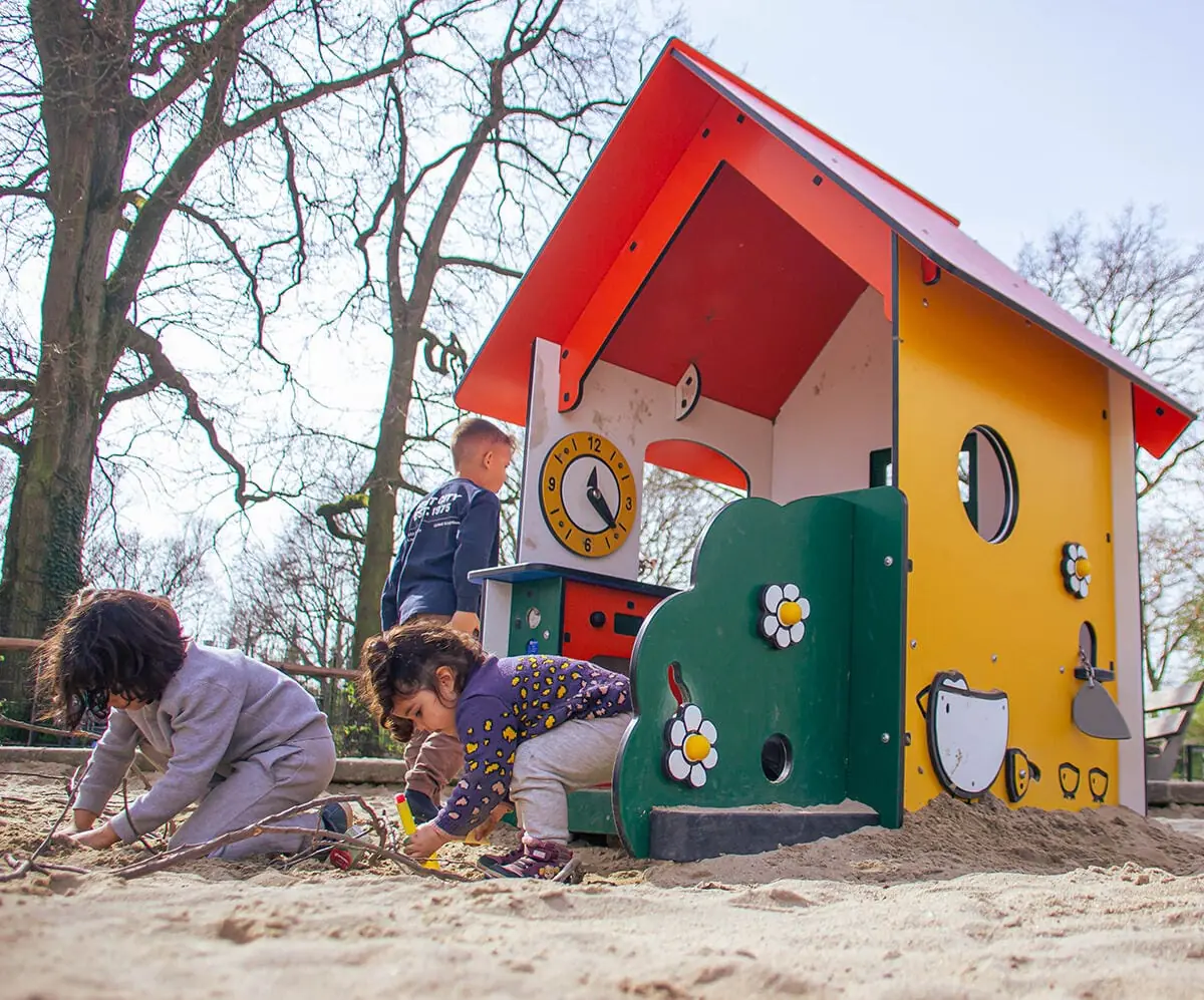 Öffentliche Spielgeräte müssen extremen Belastungen standhalten. Miffys Haus ist aus hochwertigen, witterungsbeständigen Materialien gefertigt. Die Platten aus durchgefärbtem HDPE bleichen nicht aus, die recycelbaren Kunststoffböden verrotten nicht und die Metallteile sind für eine lange Lebensdauer pulverbeschichtet. Das sichert eine nachhaltige Investition mit minimalem Wartungsaufwand.