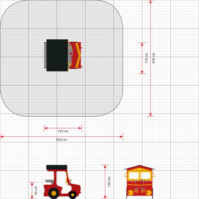 - Platzbedarf inkl. Sicherheitsabstände (LxB): 433 x 410 cm