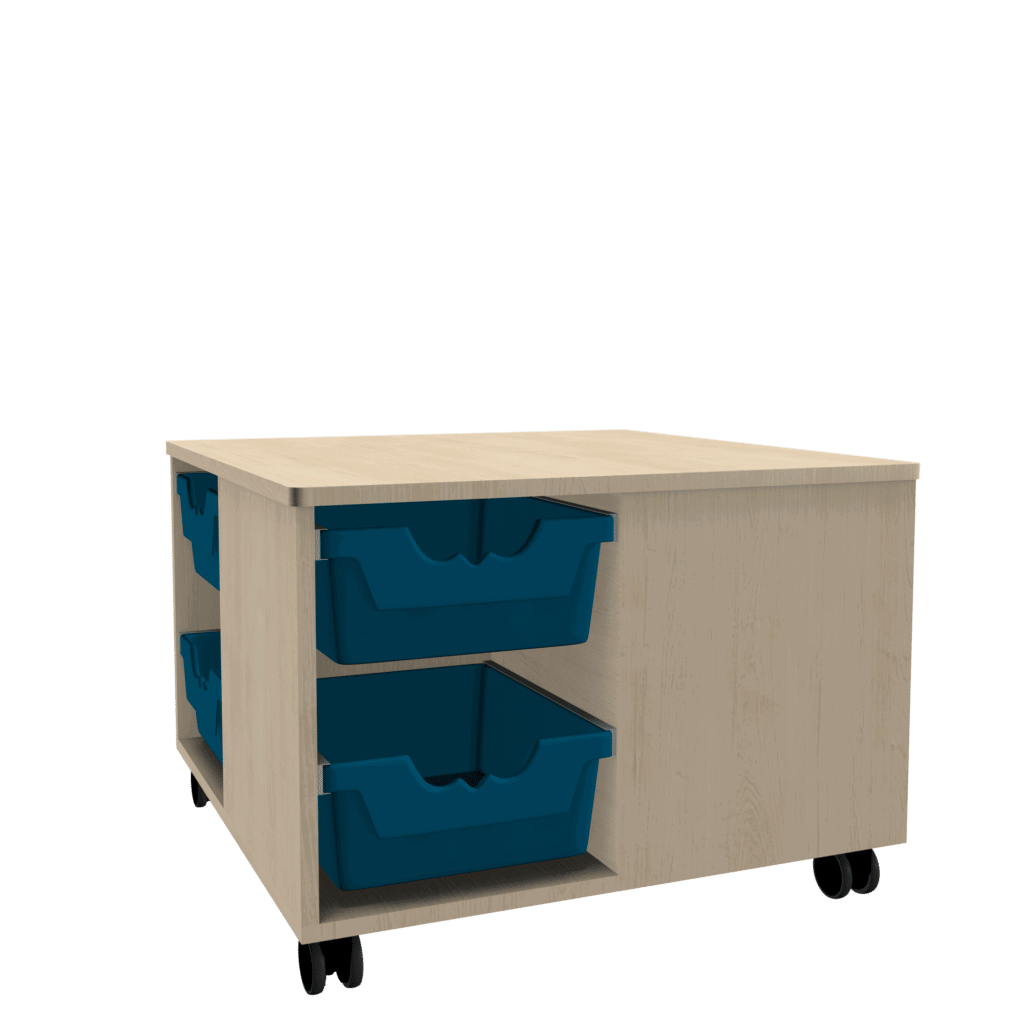 Unsere Spielinsel ist dank ihrer 8 hohen Ergo Tray Boxen C2 die perfekte Lösung um alle Spielsachen beisammen zu halten. Gleichzeitig ist sie mit vier Rollen (2 davon feststellbar) mobil einsetzbar und kann beliebig verschoben werden. Die Arbeitsfläche dient dabei als Spieloberfläche auf der gebastelt, gemalt, oder gespielt werden kann.