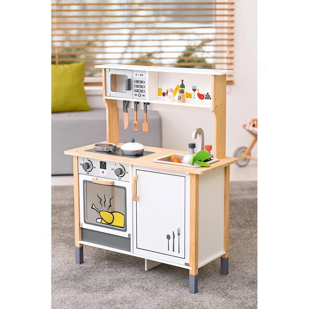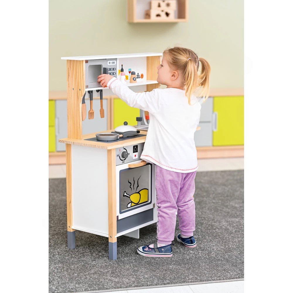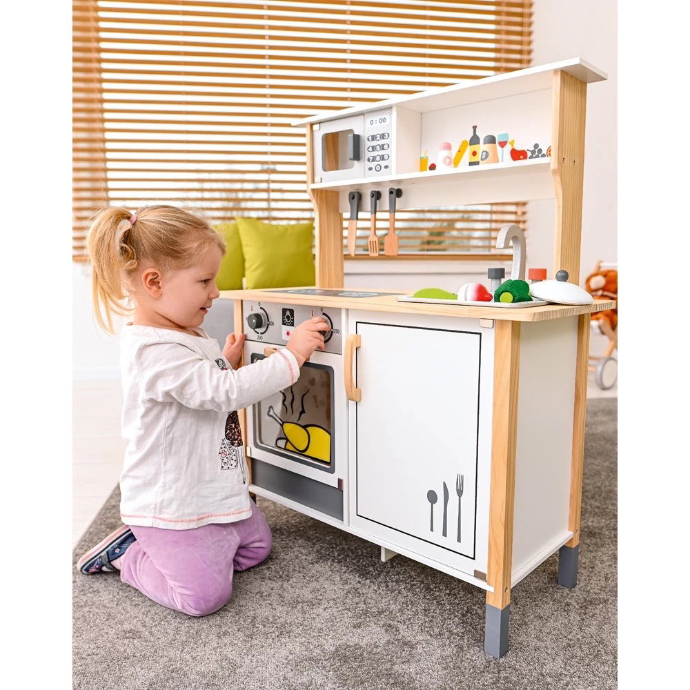 Gefertigt aus robustem Holz, bringt „Eva“ eine warme und natürliche Atmosphäre in jedes Kinderzimmer. Mit ihren kompakten Maßen findet sie auch in kleineren Räumen problemlos Platz. Die Küche ist mit allem ausgestattet, was man für den Start braucht: liebevoll gestaltete Kochfelder, drehbare Knöpfe mit Klickgeräuschen und ein praktisches Spülbecken. Das mitgelieferte Zubehör sorgt dafür, dass der Spielspaß sofort beginnen kann. Hier wird nicht nur gekocht, sondern auch gelernt, gelacht und geträumt.