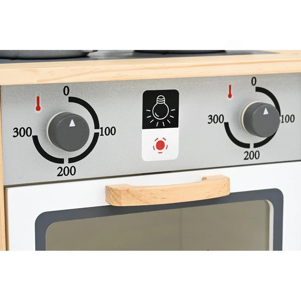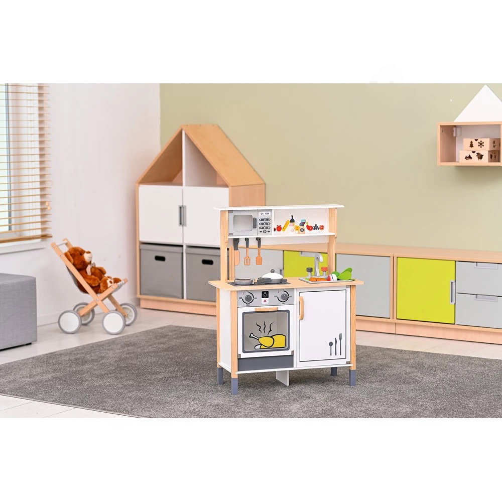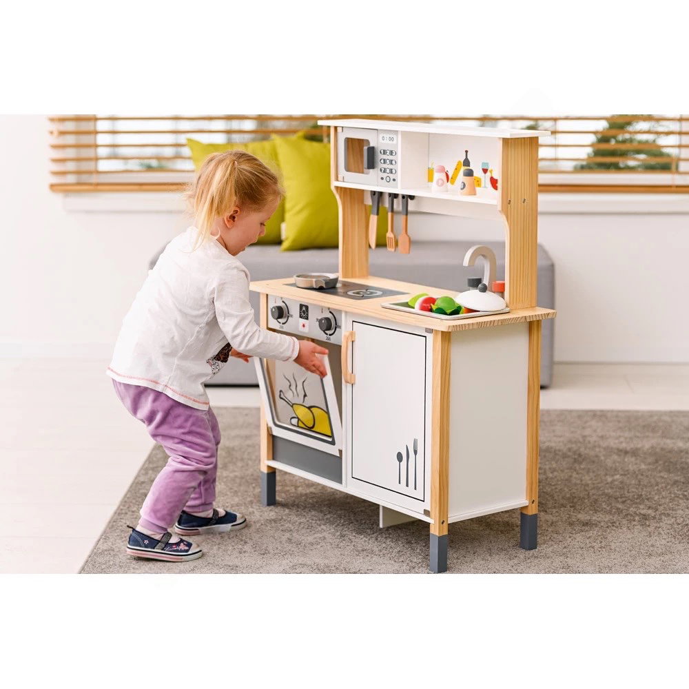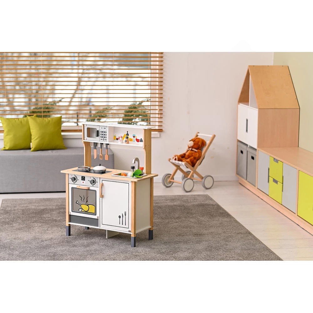 Gefertigt aus robustem Holz, bringt „Eva“ eine warme und natürliche Atmosphäre in jedes Kinderzimmer. Mit ihren kompakten Maßen findet sie auch in kleineren Räumen problemlos Platz. Die Küche ist mit allem ausgestattet, was man für den Start braucht: liebevoll gestaltete Kochfelder, drehbare Knöpfe mit Klickgeräuschen und ein praktisches Spülbecken. Das mitgelieferte Zubehör sorgt dafür, dass der Spielspaß sofort beginnen kann. Hier wird nicht nur gekocht, sondern auch gelernt, gelacht und geträumt.