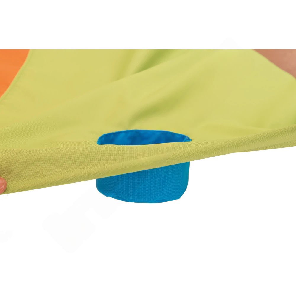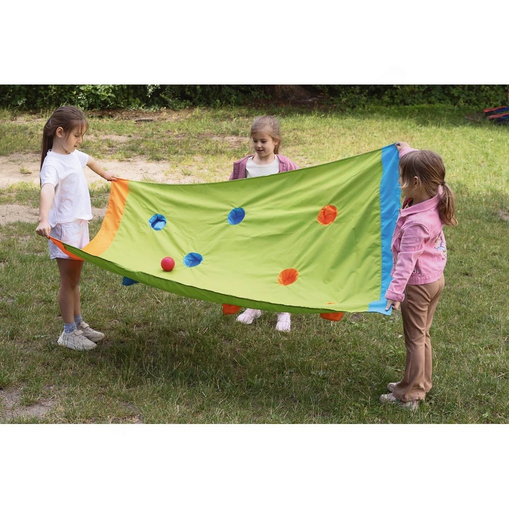 Das leichte Tuch ist im Handumdrehen ausgebreitet und einsatzbereit – egal ob in der Turnhalle, im Gruppenraum oder draußen auf der Wiese. Nach dem Spiel lässt es sich platzsparend zusammenfalten und verstauen.
