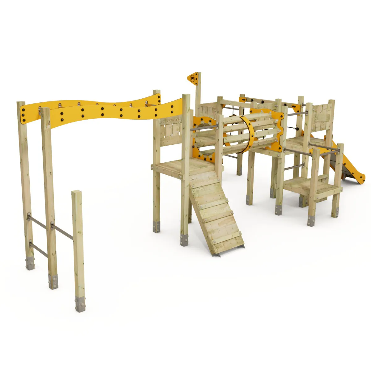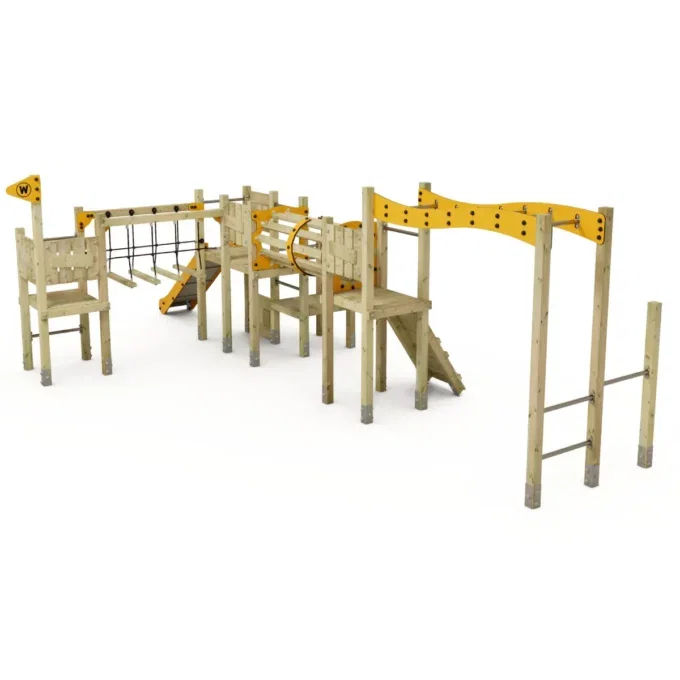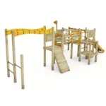 Besondere Aufmerksamkeit wurde bei der Auswahl der Materialien gelegt. Die aus massivem Holz gefertigte Struktur und die zu 80 % recycelten HDPE-Komponenten gewährleisten nicht nur eine langfristige Nutzung, sondern tragen auch zu einer nachhaltigeren Produktionsweise bei. Dieses Spielgerät ist eine umweltbewusste Wahl für Betreiber von Spielanlagen.