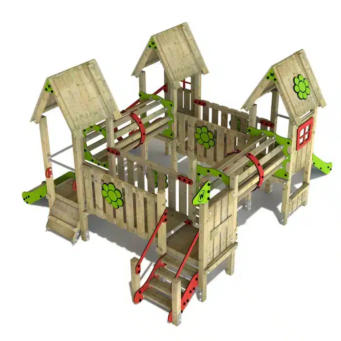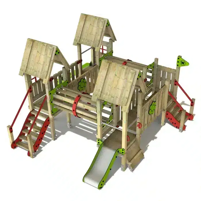 - Drei Holzdächer, zwei Holzbrücken und zwei Holztunnel fördern die Fantasie und das kreative Spiel.