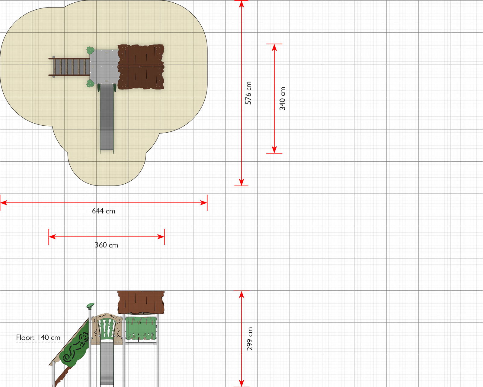 - Platzbedarf inkl. Sicherheitsabstände (LxB): 644 x 576 cm