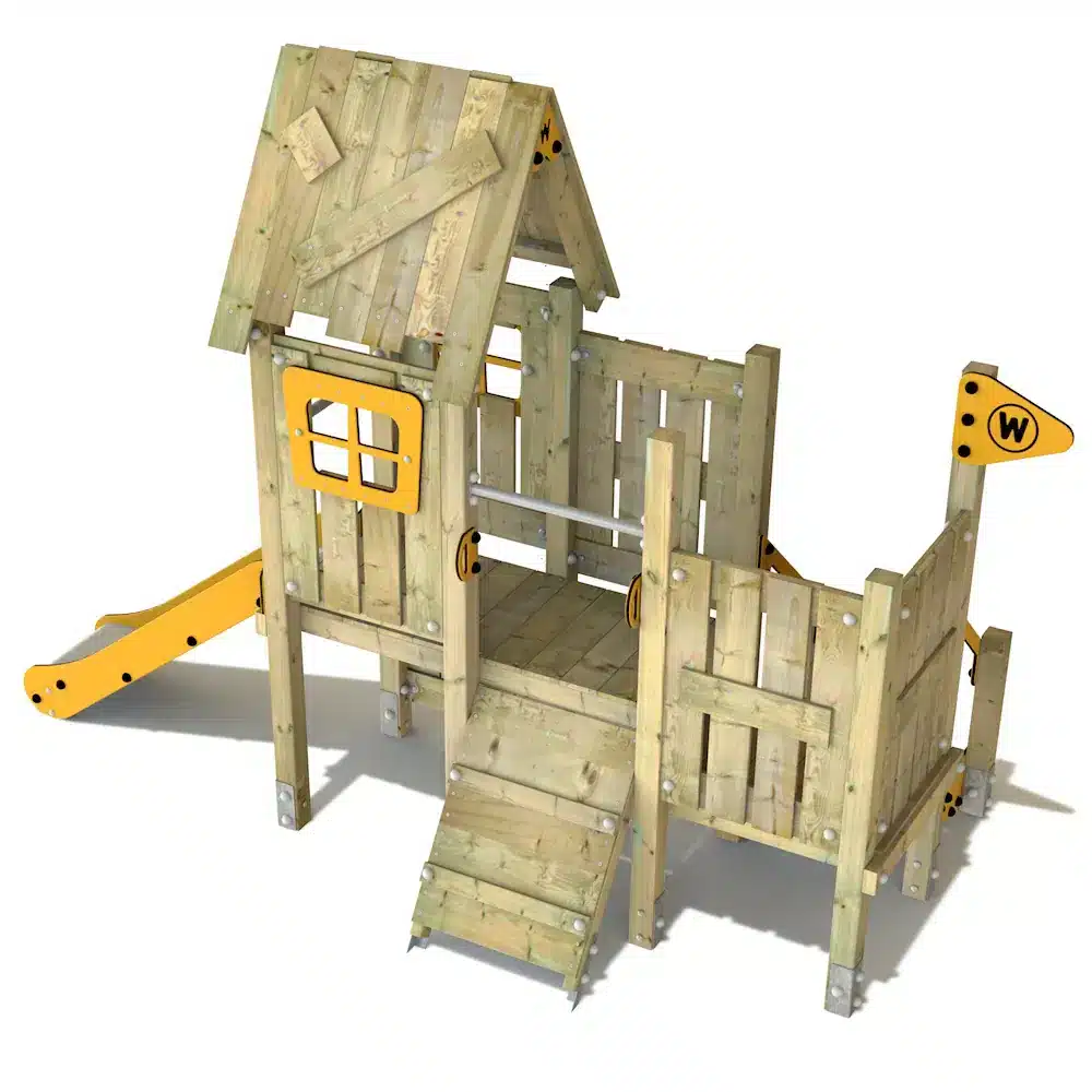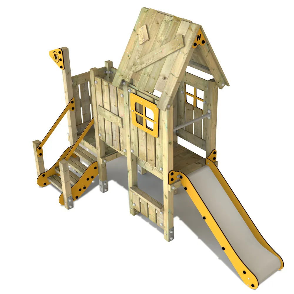 Der Wickey PRO MAGIC Ball bietet den kleinen Abenteurern zahlreiche Möglichkeiten, sich auszutoben. Mit einem Spielpodest auf 60 cm und einem weiteren auf 90 cm Höhe, einer HDPE-Rutsche für rasante Abfahrten und einem Holzdach, das Schatten spendet, können die Kinder spielen, was das Zeug hält!