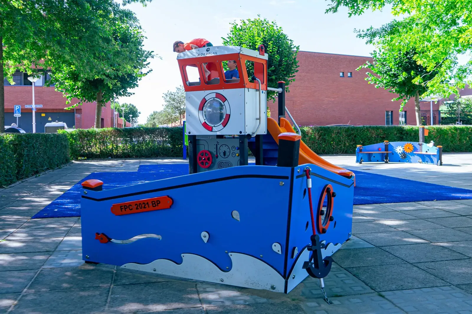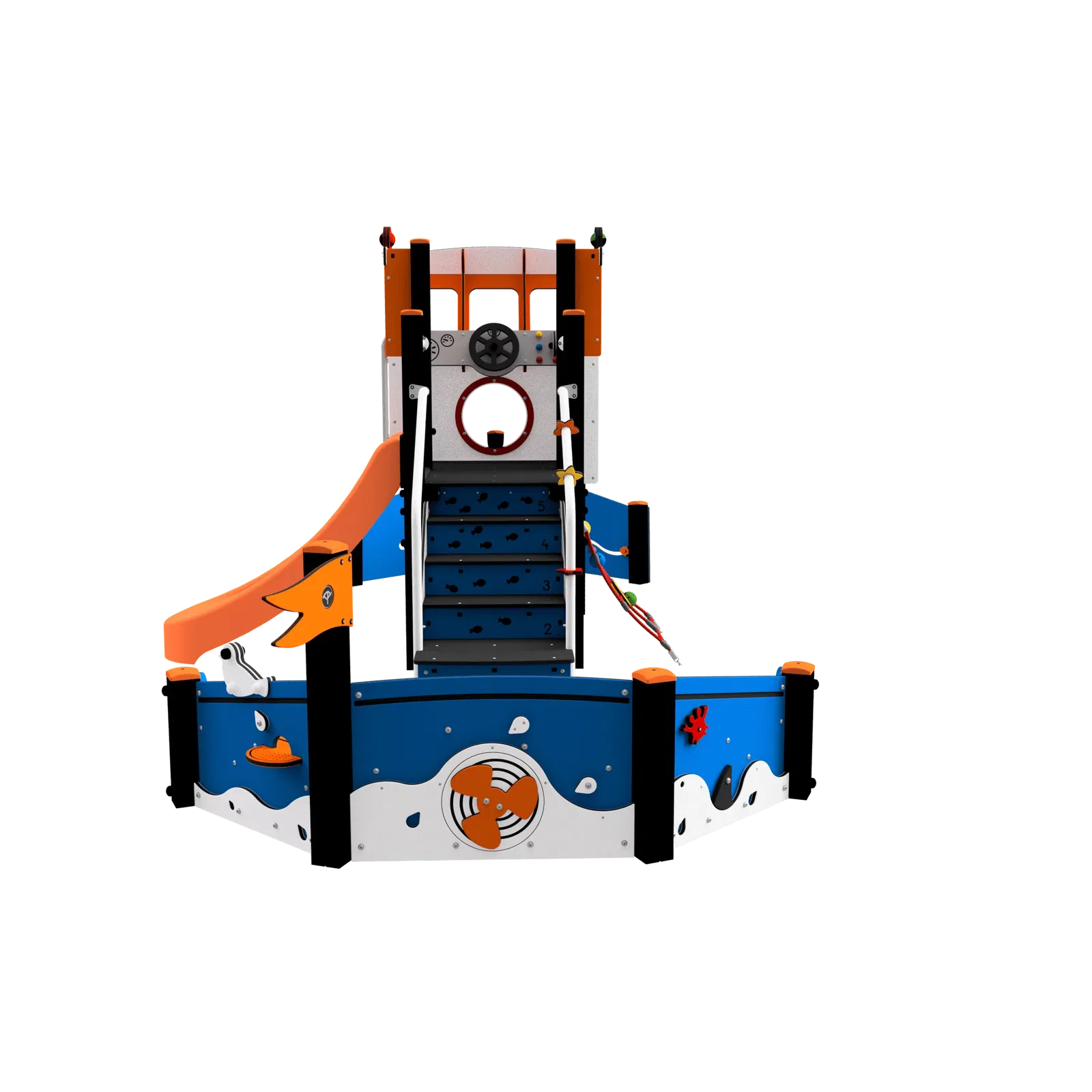 Als Kapitän auf der Brücke stehen, gemeinsam den „Fang“ einholen oder über die Rutsche schnell von Bord gehen – das Spielschiff bietet unzählige Anlässe für gemeinsames Spiel. Kinder lernen hier, miteinander zu kommunizieren, Rollen zu verteilen, zusammenzuarbeiten und Konflikte zu lösen. Die thematische Gestaltung regt die Fantasie an und inspiriert zu immer neuen Geschichten. - Vielseitige Bewegungsanreize