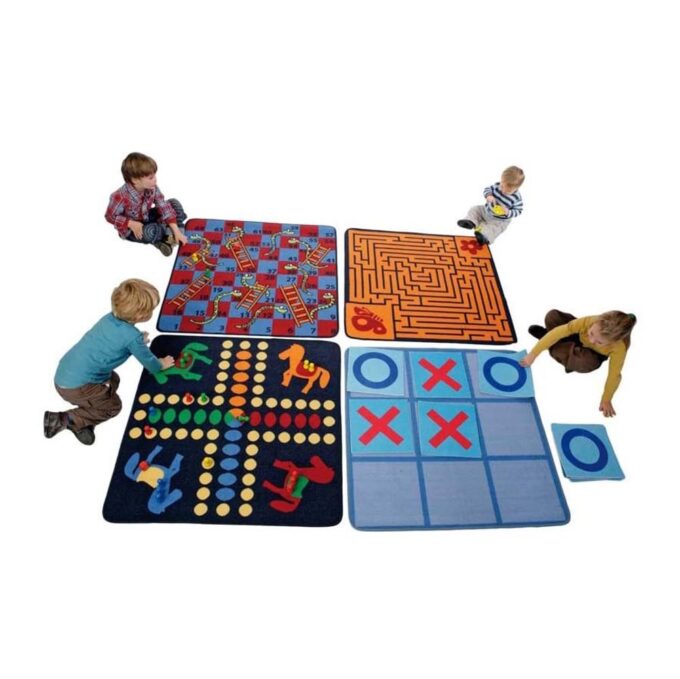 Entdecken Sie die zeitlosen Klassiker neu – im Großformat und direkt auf dem Boden des Kinderzimmers! Das Spielteppich-Set „Classic“ holt vier beliebte Brettspiele aus dem Schrank und verwandelt sie in interaktive, begehbare Spielfelder. Dieses vierteilige Set besteht aus je einem Teppich für „Mensch ärgere Dich nicht“ (Ludo), Leiterspiel, Tic-Tac-Toe und ein kniffliges Labyrinth. Auf einer komfortablen Größe von jeweils 100 x 100 cm bieten diese Teppiche reichlich Platz für gemeinsames Spielen, fördern die Interaktion und bringen Bewegung in klassische Spielrunden.