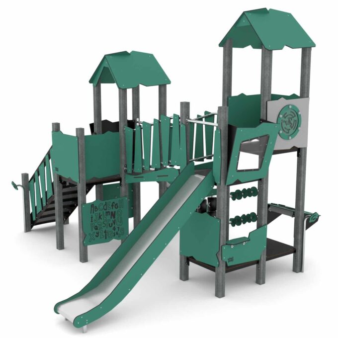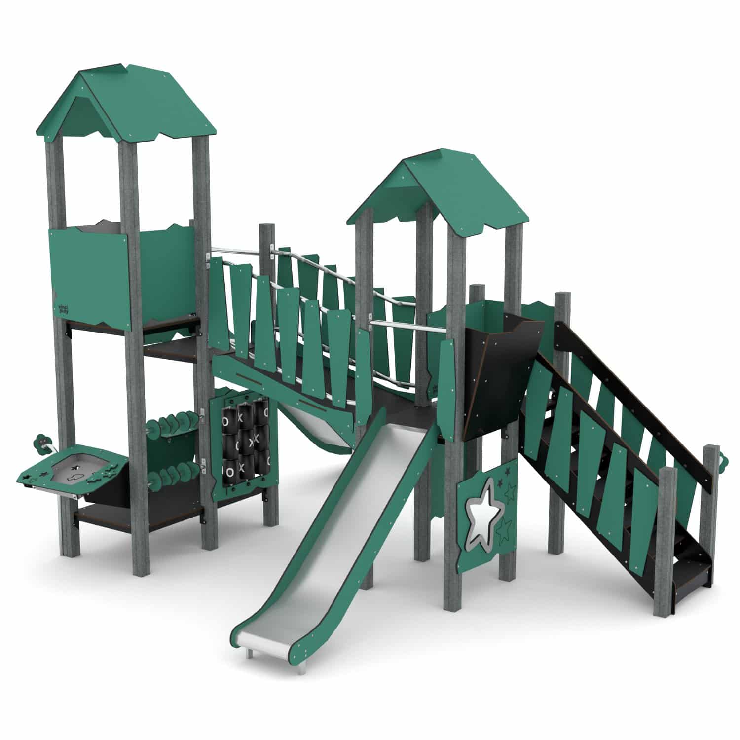 Spielturm-Anlage mit 2 Türmen, Rutsche, Brücke und Spielwänden – RECYCLED RC1504 von Vinci Play – Ein Spielparadies für kleine Abenteurer!