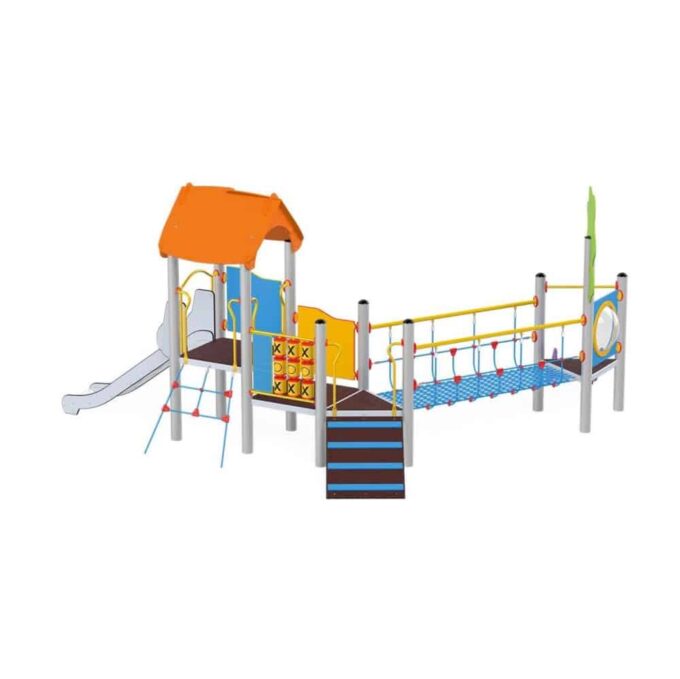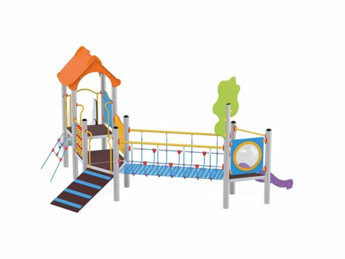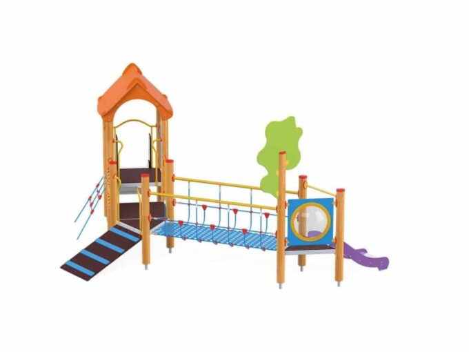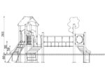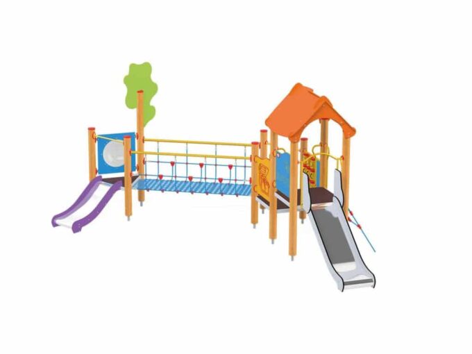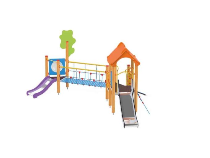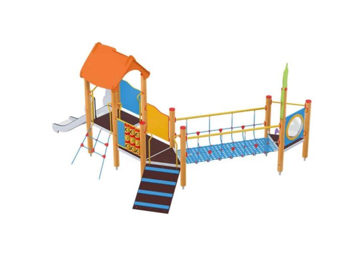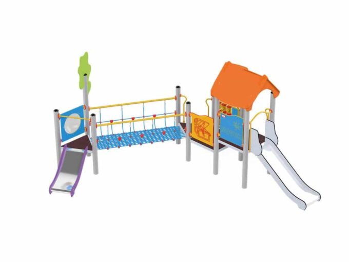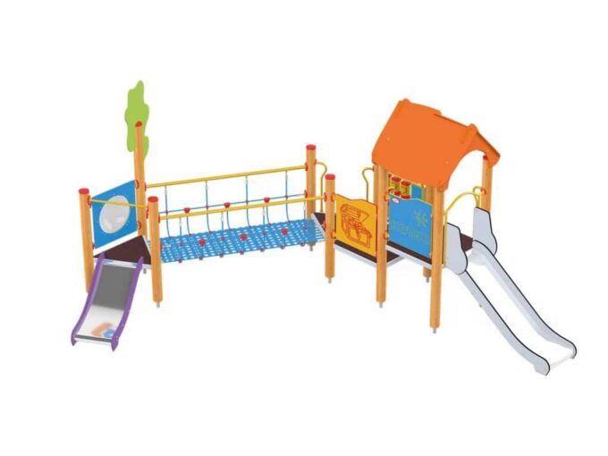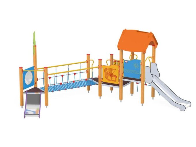 1 quadratische Plattformen, ein Satteldach, Kletternetze, Aufstiege 1 Edelstahlrutsche, eine große und kleine Brücke. Diese Spielanlage ist auch als Ausführung mit feuerverzinkten Pfosten erhältlich.