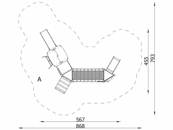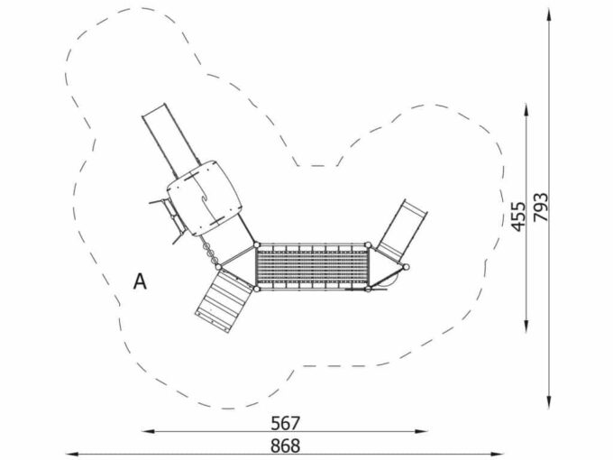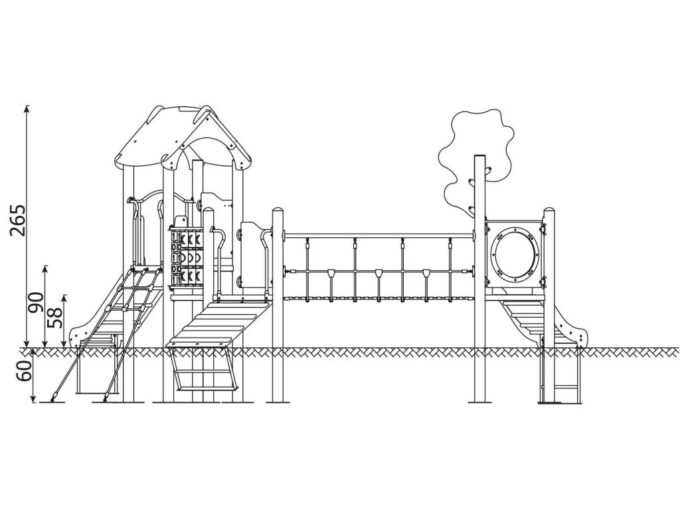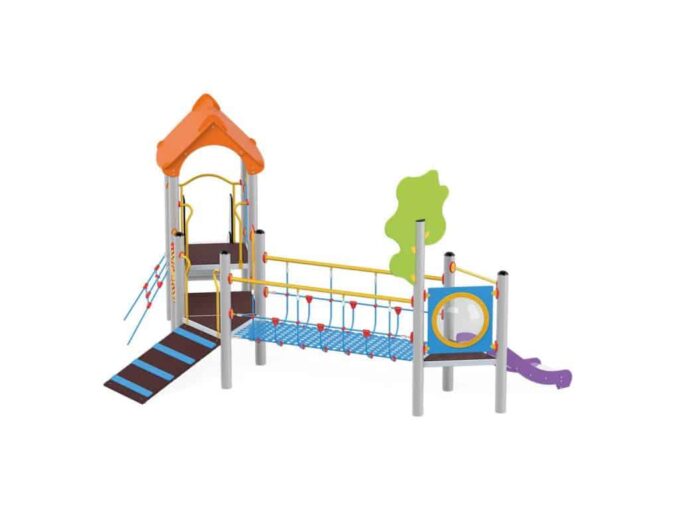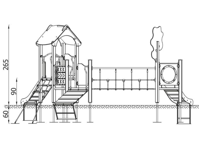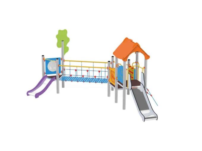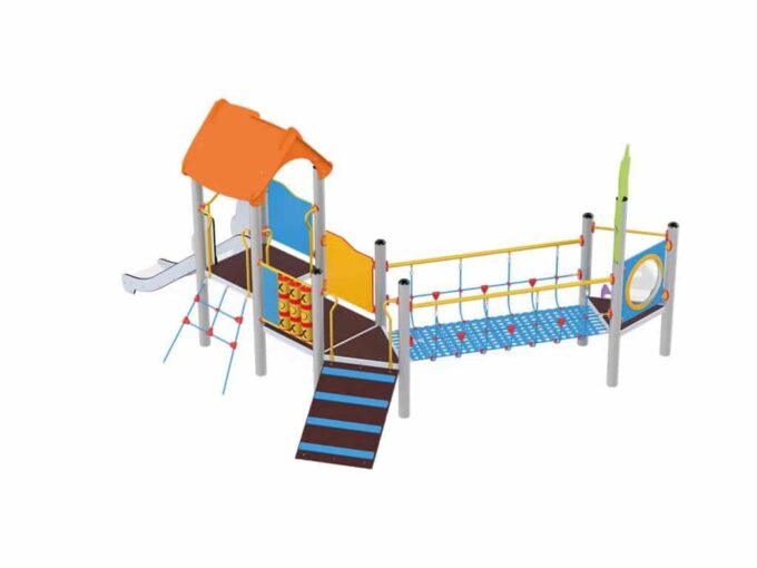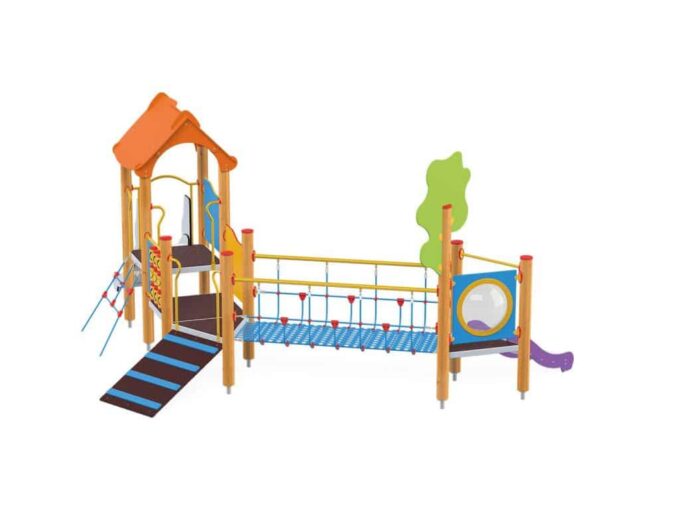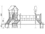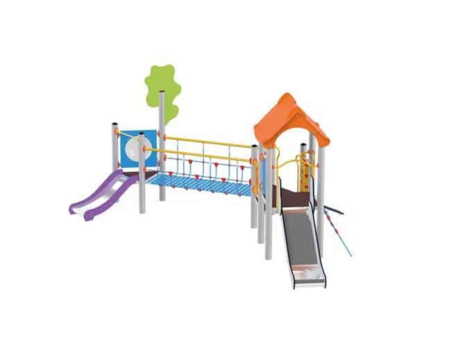 1 quadratische Plattformen, ein Satteldach, Kletternetze, Aufstiege 1 Edelstahlrutsche, eine große und kleine Brücke. Diese Spielanlage ist auch als Ausführung mit feuerverzinkten Pfosten erhältlich.