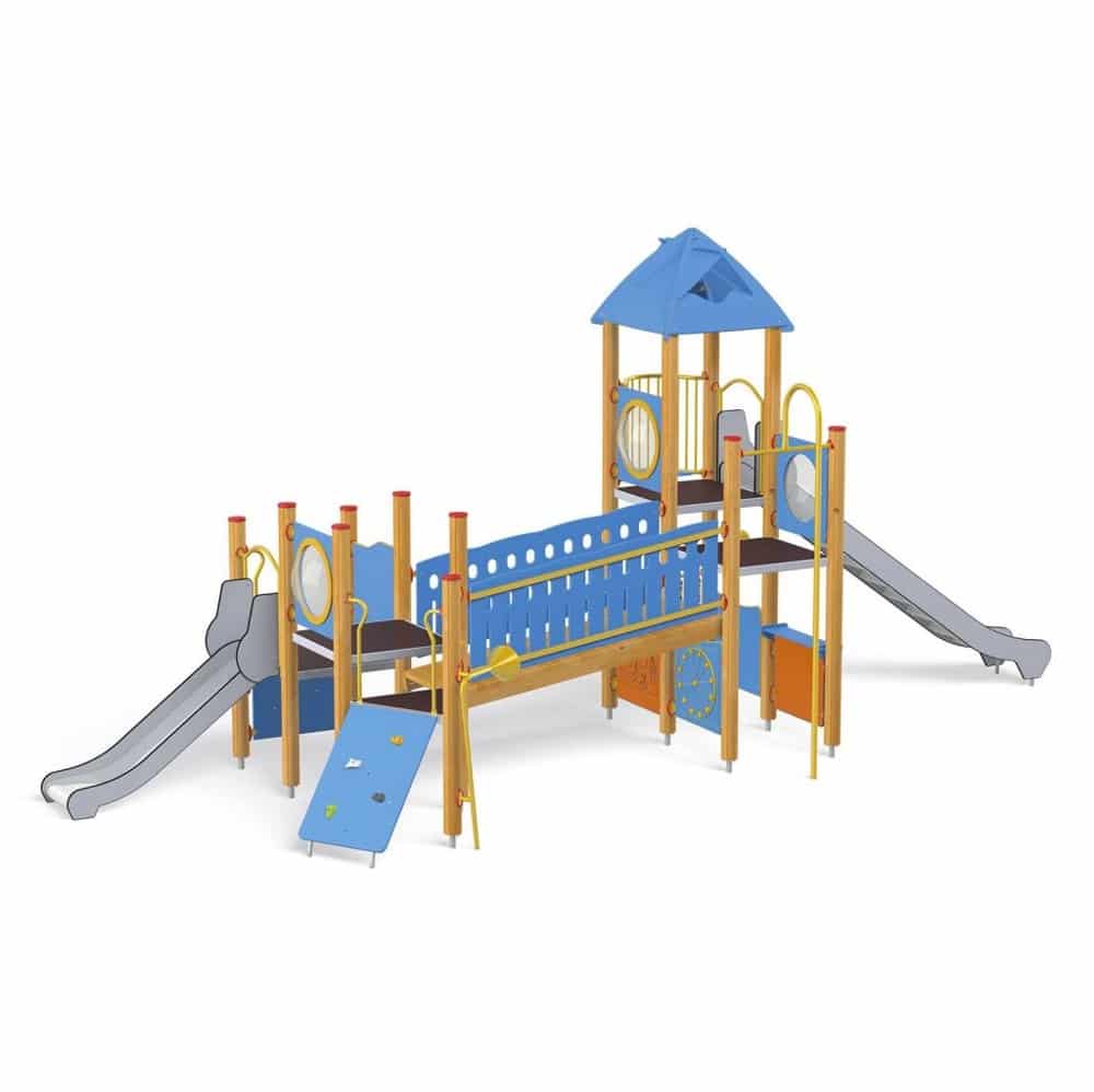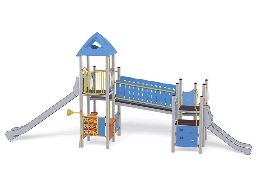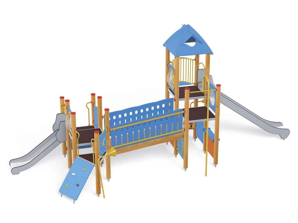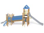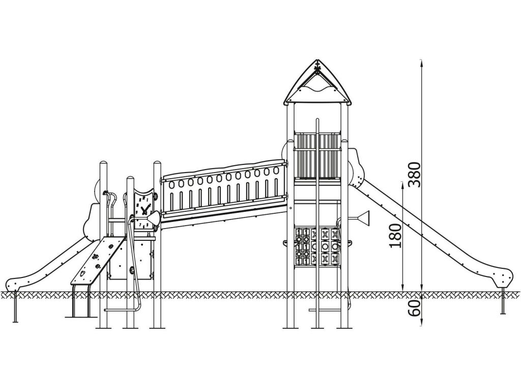 4 quadratische Plattformen, 2 Edelstahlrutschen, Kletterfalle, Seileinstieg, Kletterwand mit Loch, Satteldach,, 2 Ablagen mit Rohr zum Ausschütten von Sand, Stufe mit Doppelbefestigung, Aufstiege, TicTacToe Spiel, Brücke, Rutschstange. Diese Spielanlage ist auch als Ausführung mit feuerverzinkten Pfosten erhältlich.