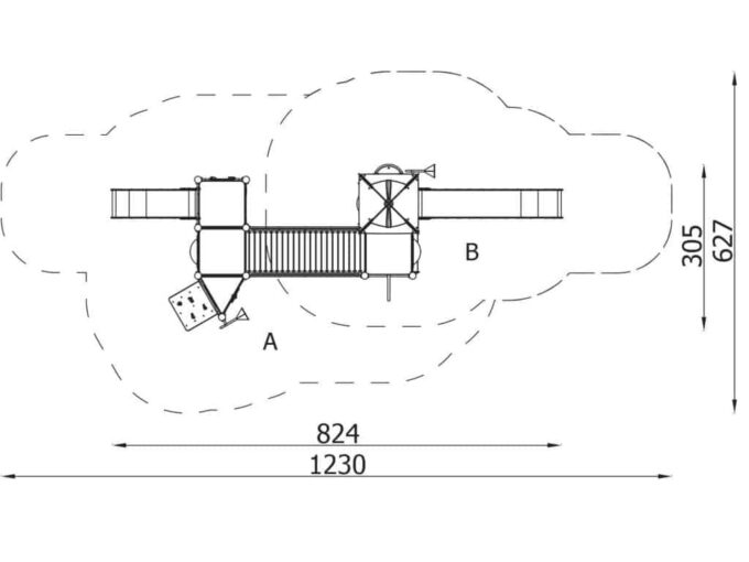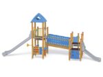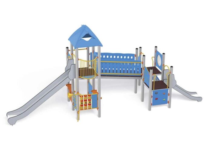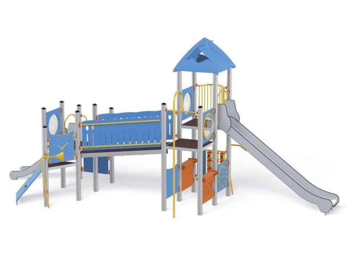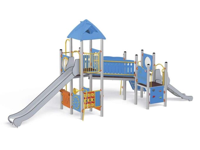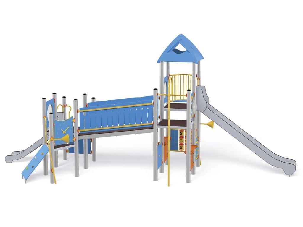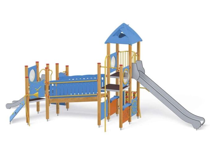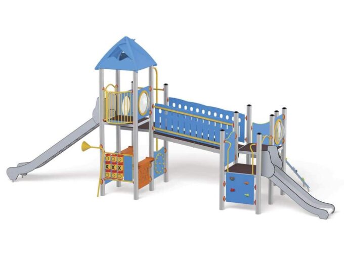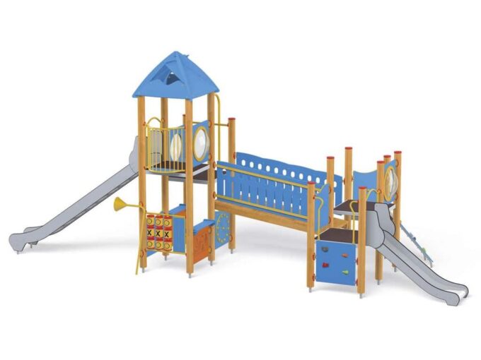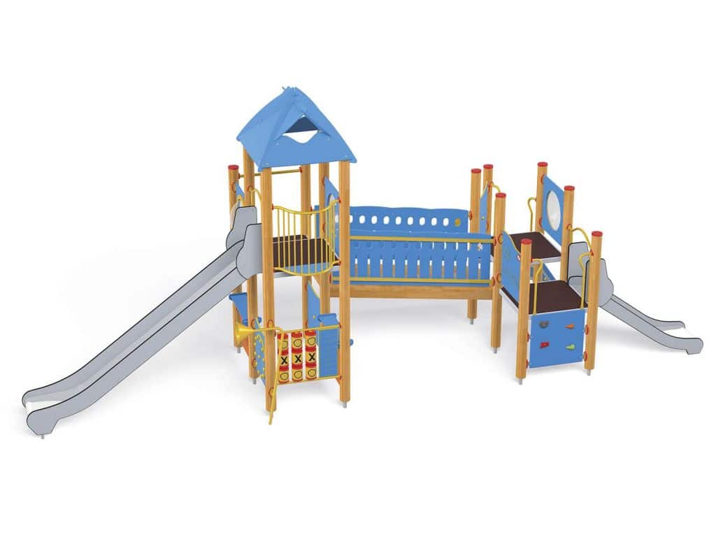 4 quadratische Plattformen, 2 Edelstahlrutschen, Kletterfalle, Seileinstieg, Kletterwand mit Loch, Satteldach,, 2 Ablagen mit Rohr zum Ausschütten von Sand, Stufe mit Doppelbefestigung, Aufstiege, TicTacToe Spiel, Brücke, Rutschstange. Diese Spielanlage ist auch als Ausführung mit feuerverzinkten Pfosten erhältlich.