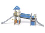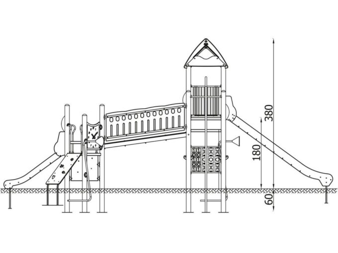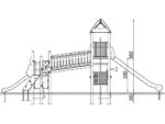 - Material: Die Tragpfosten bestehen aus runden Stahlrohren mit einem Durchmesser von 114 cm, die direkt im Boden befestigt werden. Rutschfeste Plattformen. Dächer, Sicherheitselemente und Paneele werden aus HDPE-Platten (High Durable Polyethylen) mit Musterzuschnitten hergestellt. Gleitfläche aus säurebeständigem Edelstahlblech. Seile aus Polypropylen mit Stahlkern, Stärke 16-18 mm, vandalismus- und UV-beständig. Alle Fittings und Anschlüsse sind witterungs- und UV-beständig. Stahlelemente sind durch Zinkschicht und Pulverlackierung gegen Korrosion geschützt.