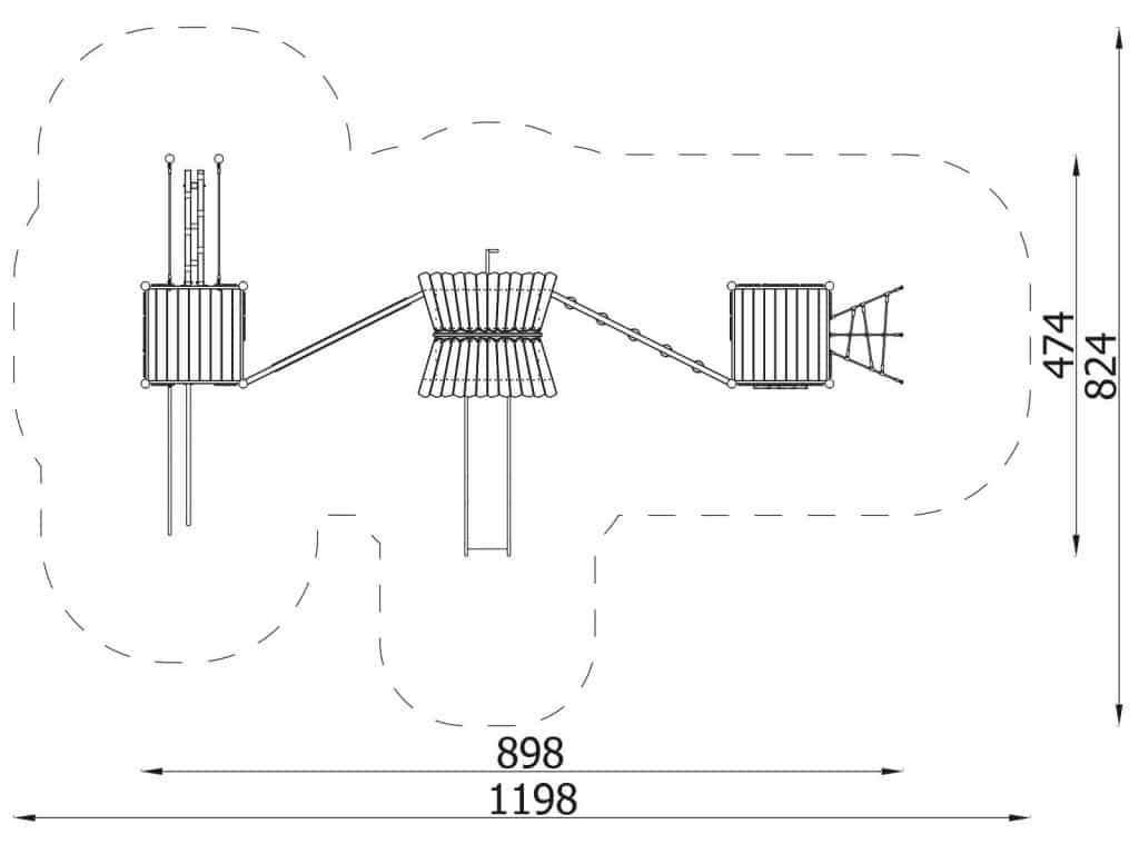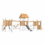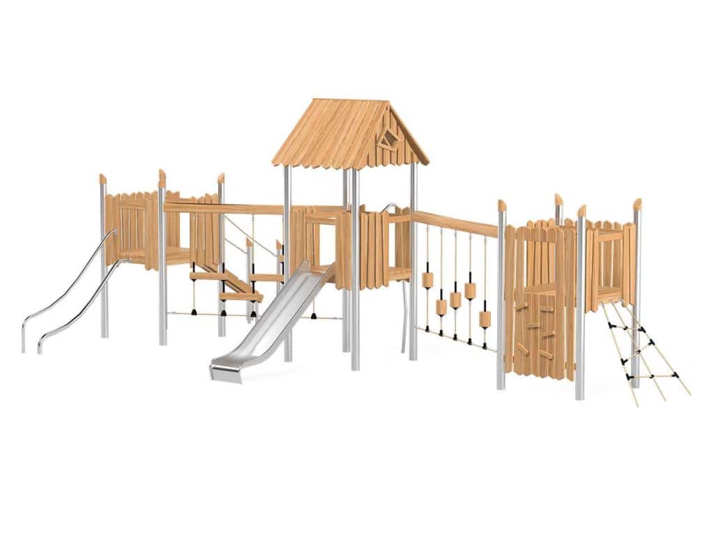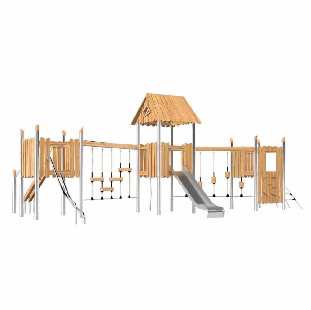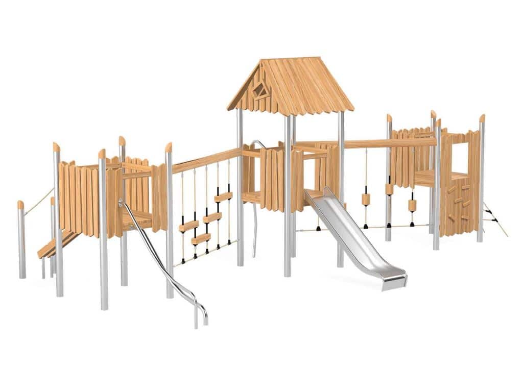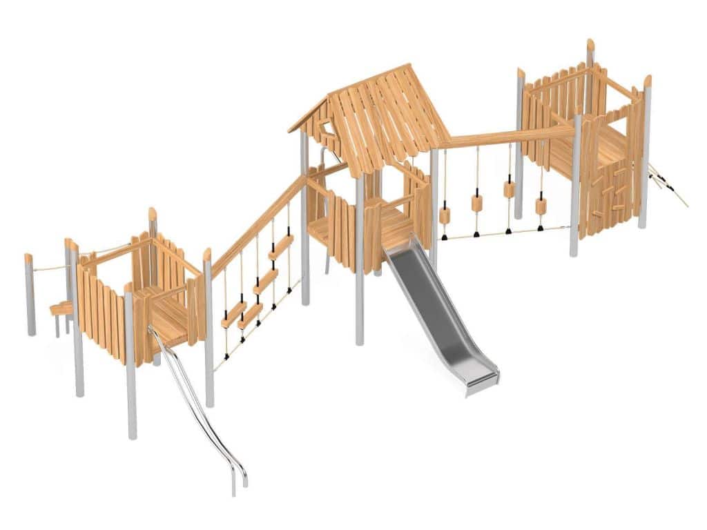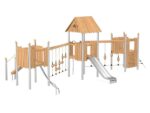 Der Spielturm-Anlage Robinio 18302 besteht aus drei Spieltürmen, eins mit Dach und zwei ohne Dach, einer Rutsche, einem Kletternetz, Rutschstange und diversen Kletterelementen. Das naturbelassene Set macht jeden Kindergarten- oder Vorschulspielplatz attraktiver. Der Spielturm ist aus hochwertigem Metall und Robinien-Holz gefertigt.