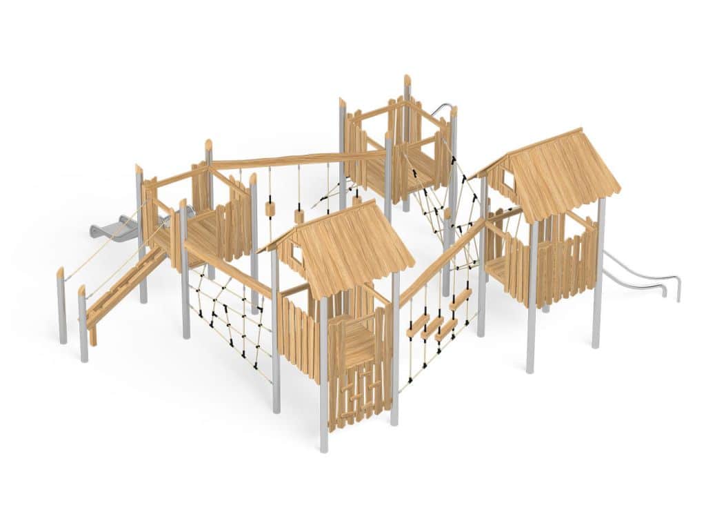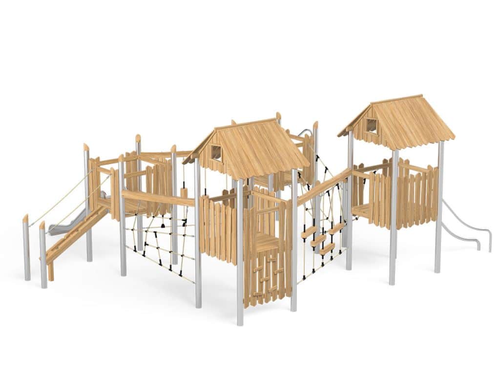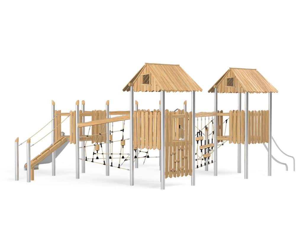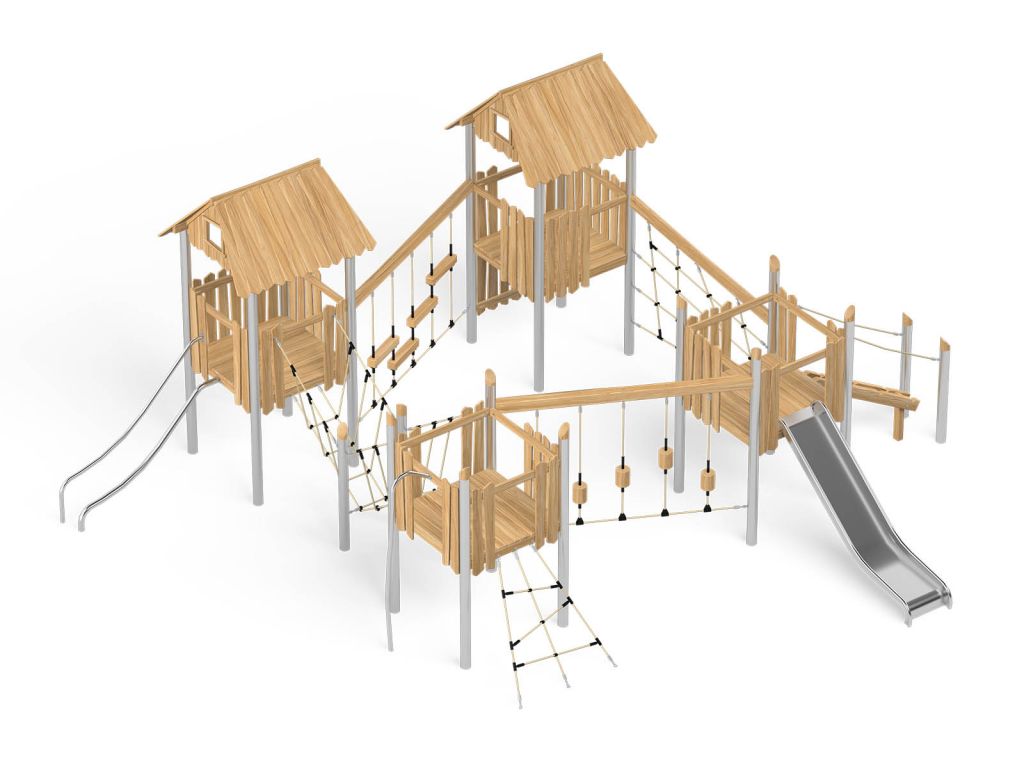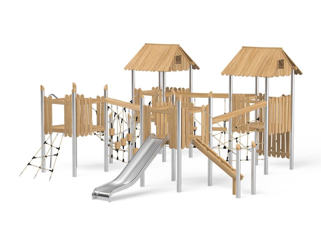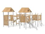 Der Spielturm-Anlage Robinio 18401 besteht aus vier Spieltürmen, zwei mit Dach und zwei ohne Dach, die jeweils mit Kletterelementen verbunden sind und zusätzlich eine Rutsche, Kletternetze und eine Rutschstange beinhalten. Das naturbelassene Set macht jeden Kindergarten- oder Vorschulspielplatz attraktiver. Der Spielturm ist aus hochwertigem Metall und Robinien-Holz gefertigt.