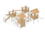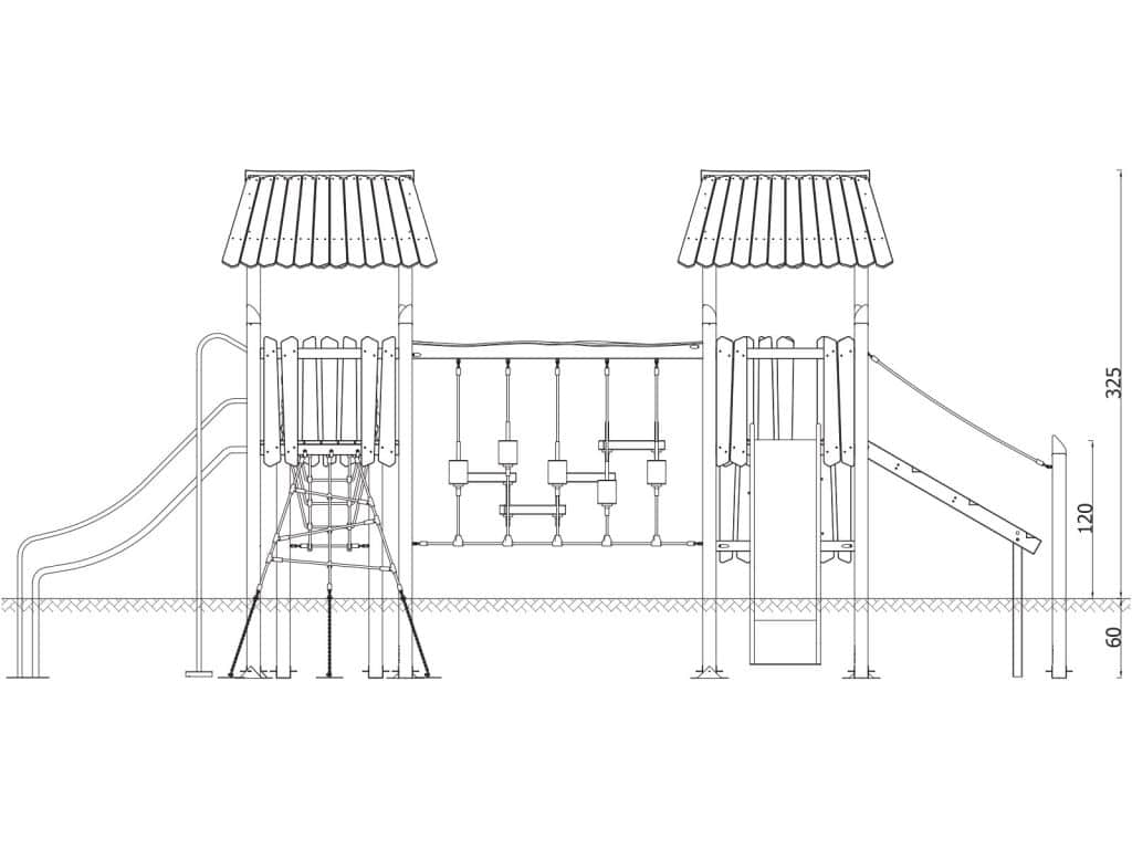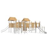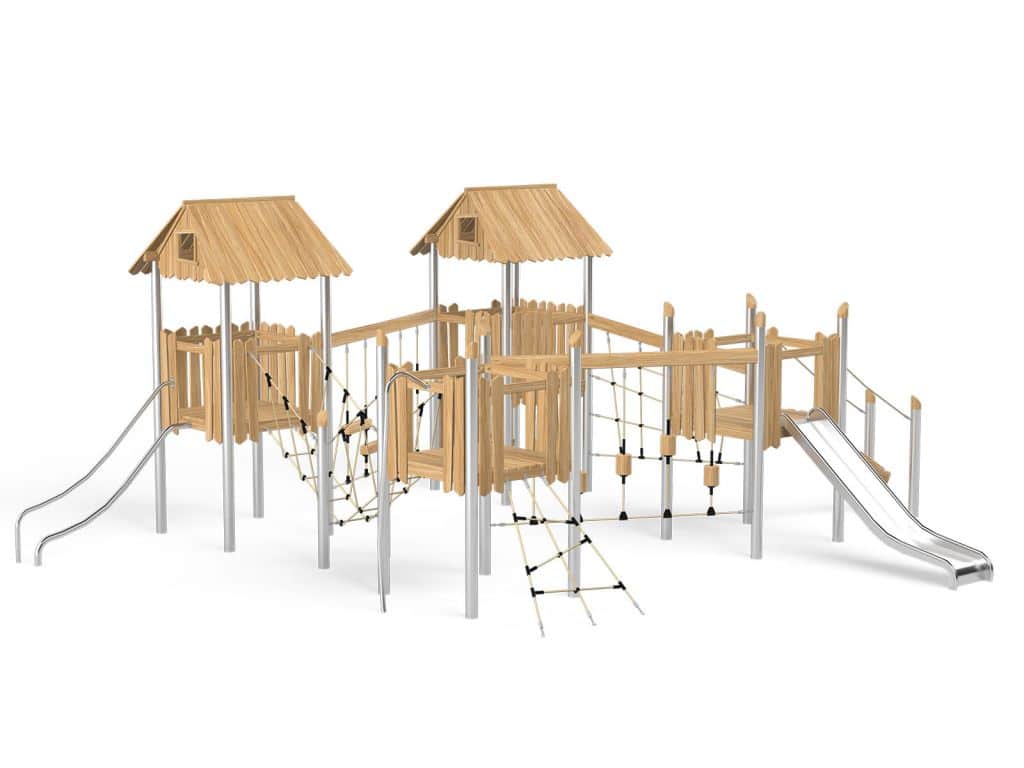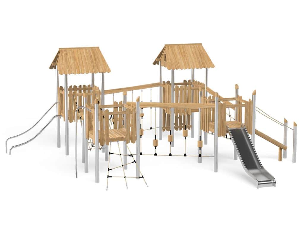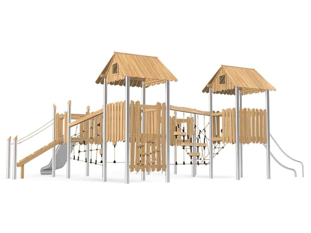 Der Spielturm-Anlage Robinio 18401 besteht aus vier Spieltürmen, zwei mit Dach und zwei ohne Dach, die jeweils mit Kletterelementen verbunden sind und zusätzlich eine Rutsche, Kletternetze und eine Rutschstange beinhalten. Das naturbelassene Set macht jeden Kindergarten- oder Vorschulspielplatz attraktiver. Der Spielturm ist aus hochwertigem Metall und Robinien-Holz gefertigt.