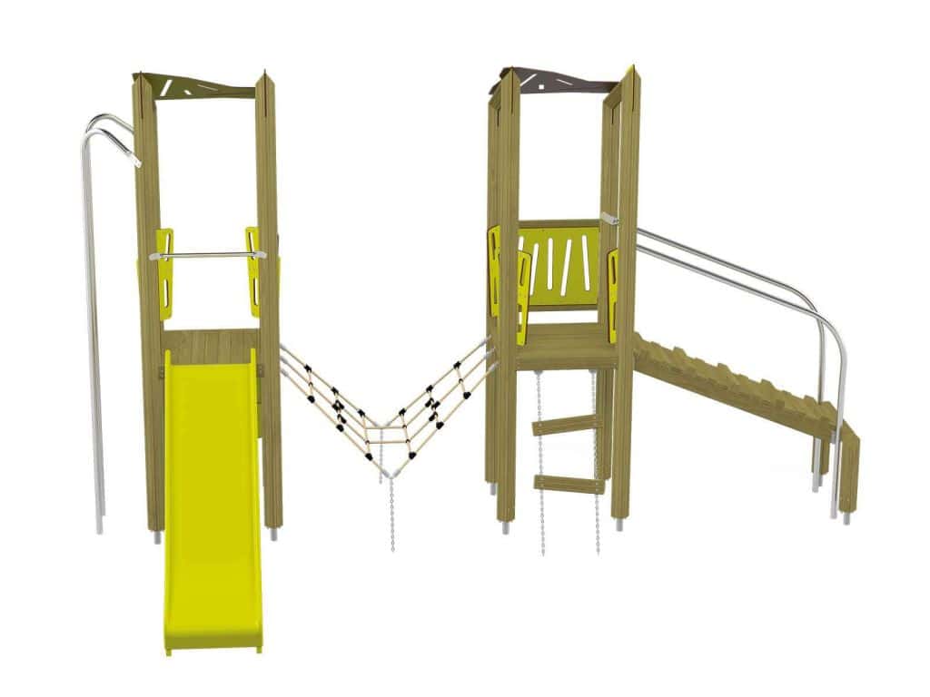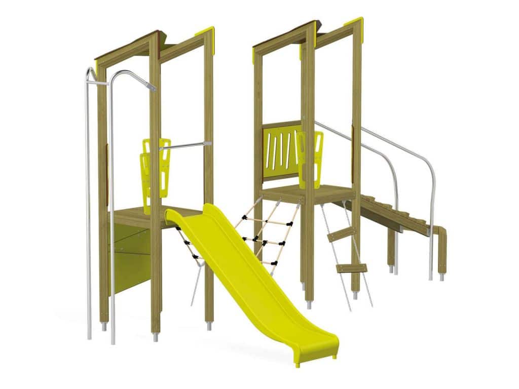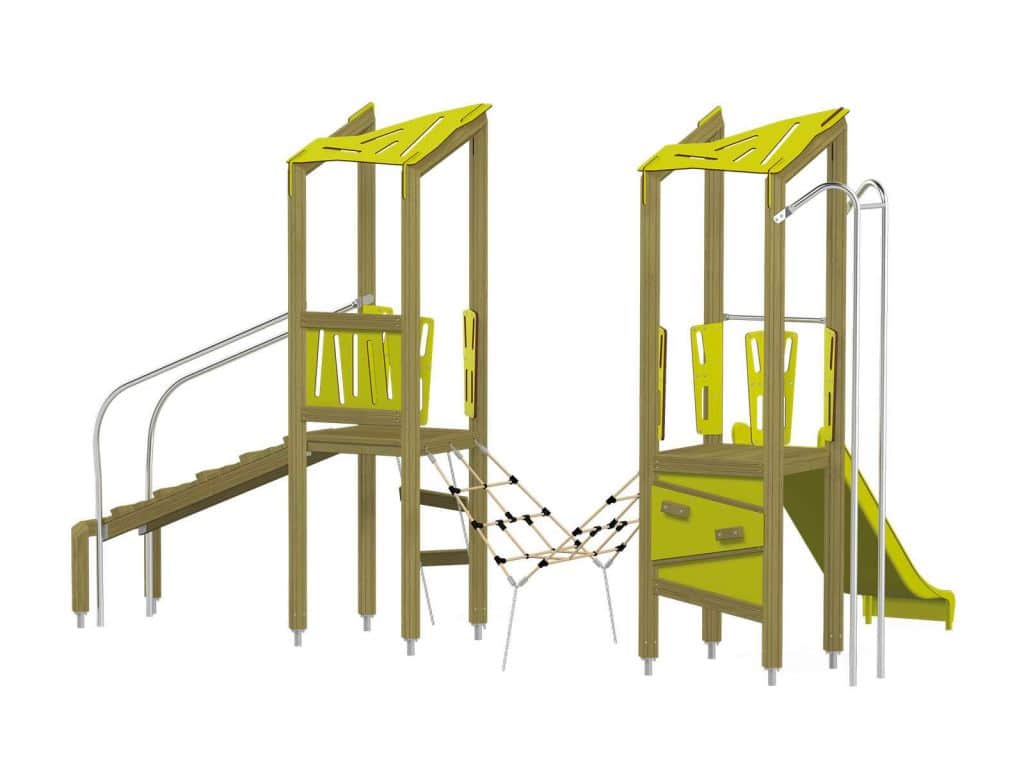 Der Spielturm Triangulo 17202 besteht aus zwei Spieltürmen. Ein Spielturm ist mit einer Rutsche und Rutschstange ausgestattet. Der zweite Spielturm besteht aus einer Rampe mit Metallschienen und einer Hängeleiter. Verbunden sind beide Türme über ein Kletternetz. Das farbenfrohe Set macht jeden Kindergarten- oder Vorschulspielplatz attraktiver.