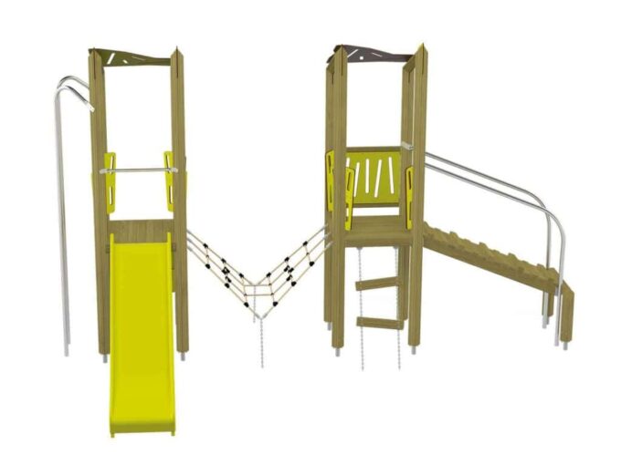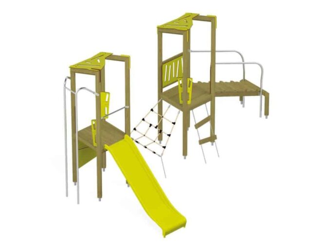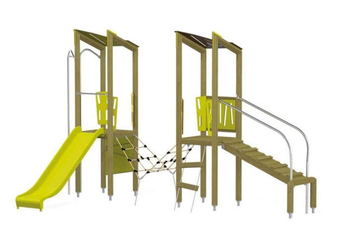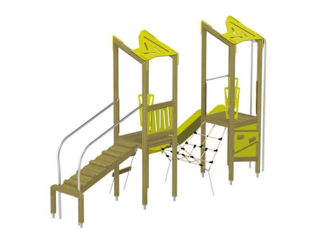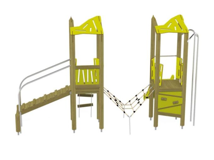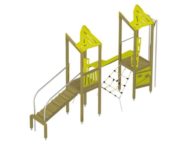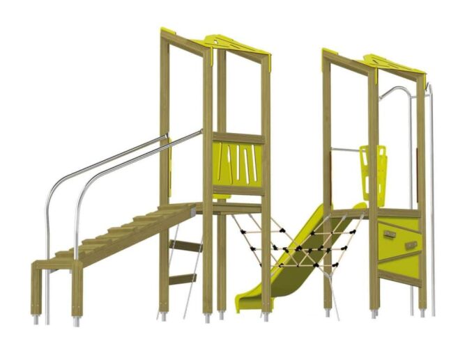 Der Spielturm Triangulo 17202 besteht aus zwei Spieltürmen. Ein Spielturm ist mit einer Rutsche und Rutschstange ausgestattet. Der zweite Spielturm besteht aus einer Rampe mit Metallschienen und einer Hängeleiter. Verbunden sind beide Türme über ein Kletternetz. Das farbenfrohe Set macht jeden Kindergarten- oder Vorschulspielplatz attraktiver.