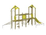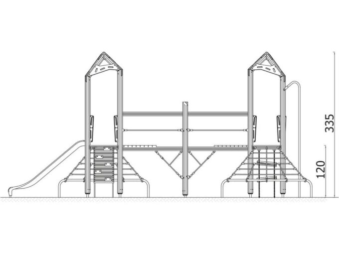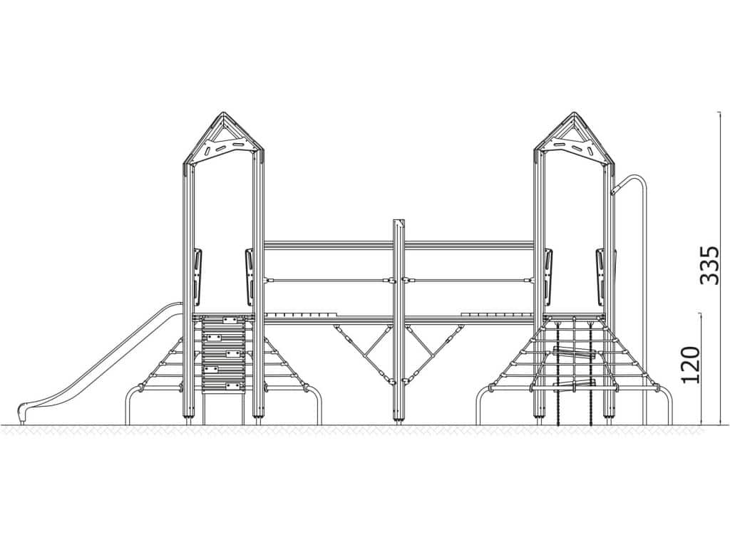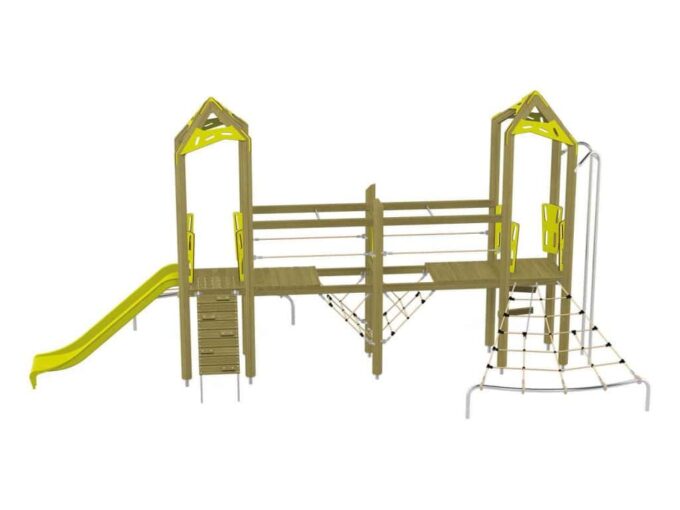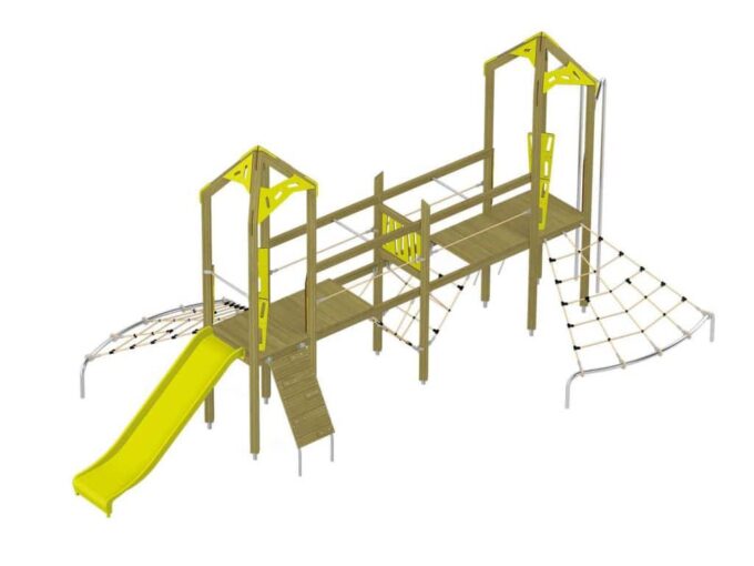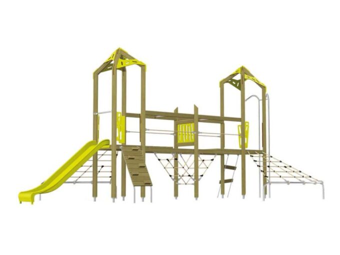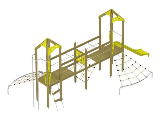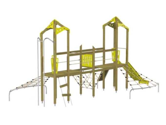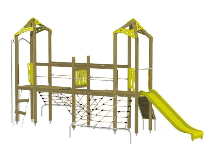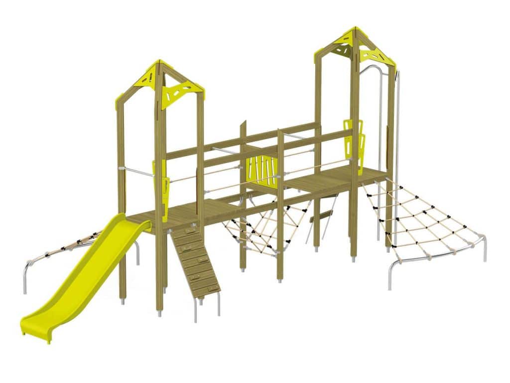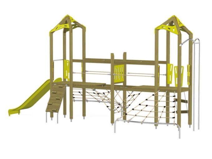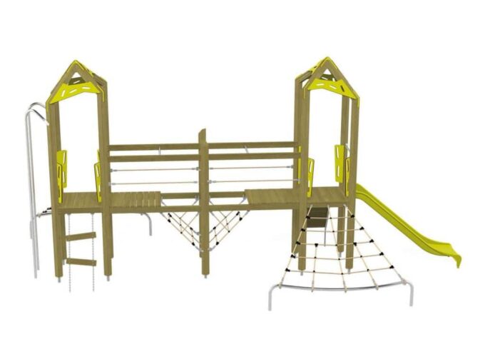 Der Spielturm-Anlage Triangulo 17203 besteht aus zwei Spieltürmen und einer Verbindungsbrücke. Ein Spielturm ist mit einer Rutsche, Kletternetz und Aufstieg ausgestattet. Der zweite Spielturm besteht aus einer Rutschstange aus Metallschienen, Kletternetz und einer Hängeleiter. Verbunden sind beide Türme über ein Kletternetz und eine Brücke. Das farbenfrohe Set macht jeden Kindergarten- oder Vorschulspielplatz attraktiver.