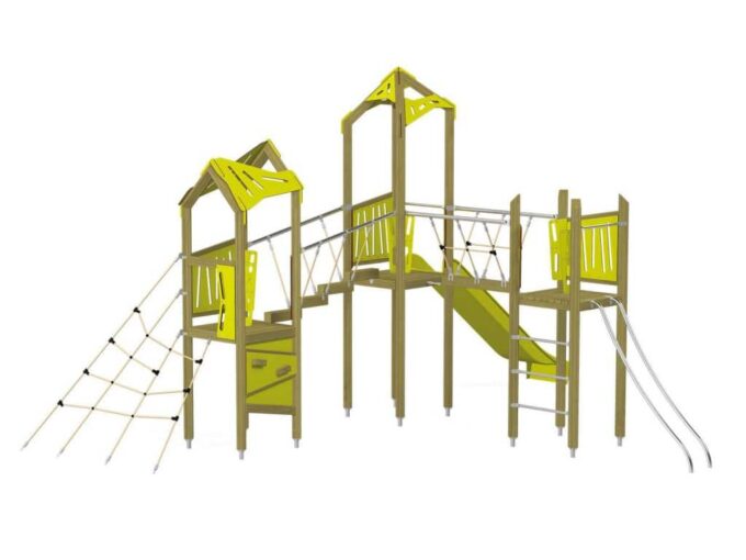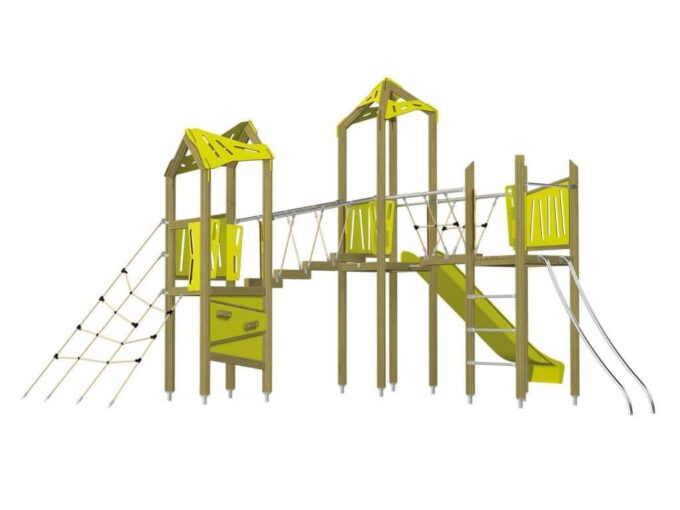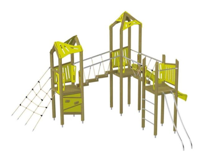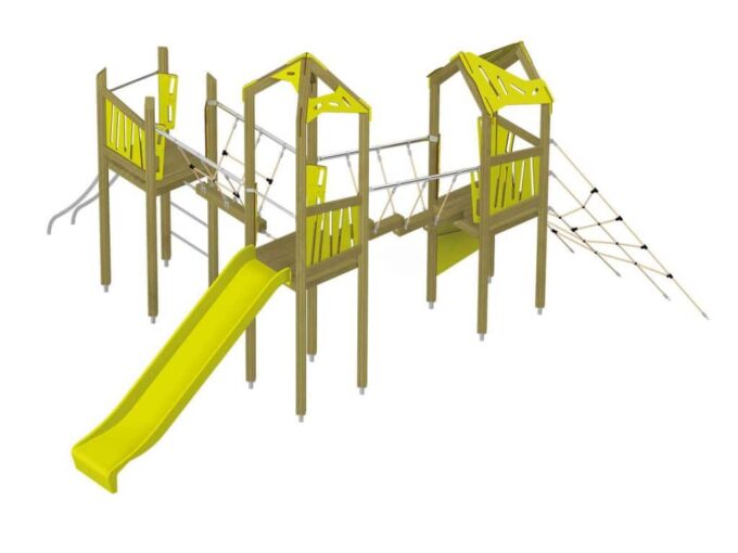 Der Spielturm-Anlage Triangulo 17302 besteht aus drei Spieltürmen, zwei davon mit Dach und ein Spielturm ohne Dach. Die Spieltürme sind mit einer Rutsche, Rutschstange, diversen Kletterelementen und zwei Brücken ausgestattet. Das farbenfrohe Set macht jeden Kindergarten- oder Vorschulspielplatz attraktiver.
