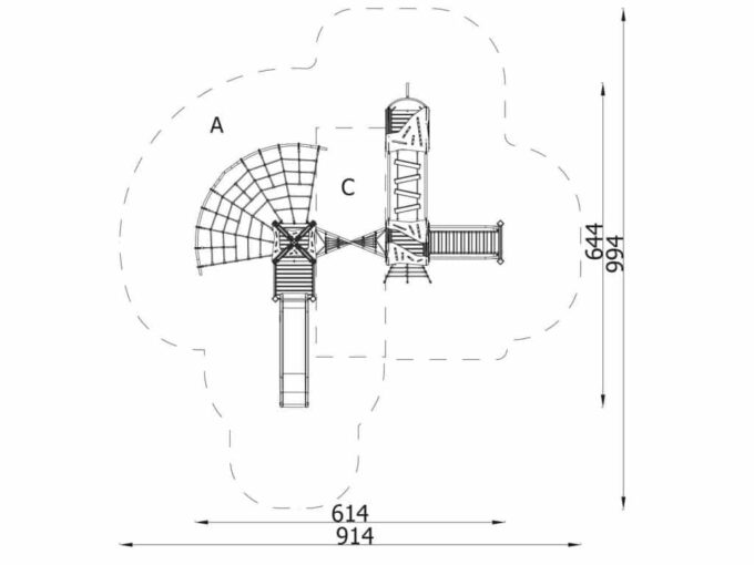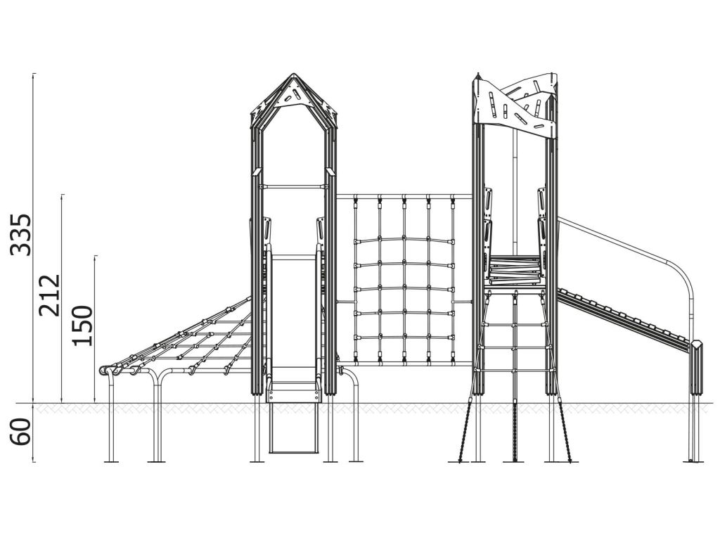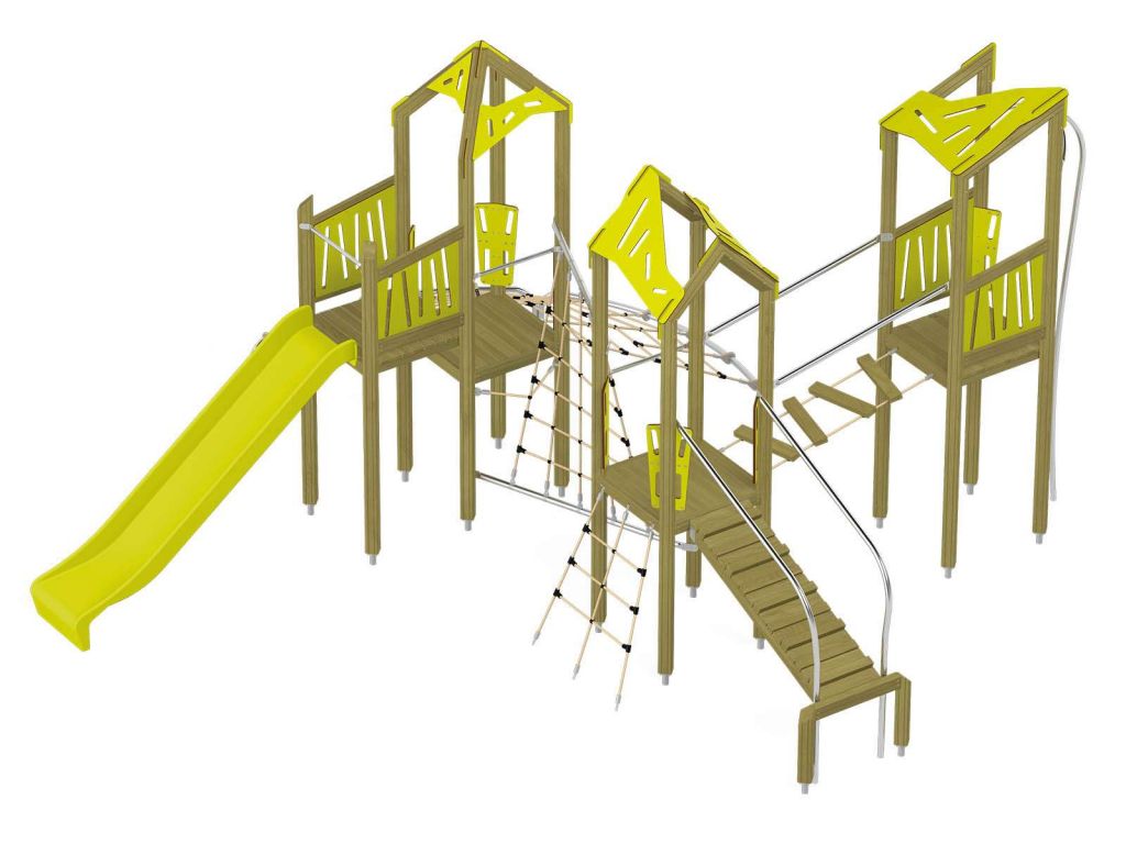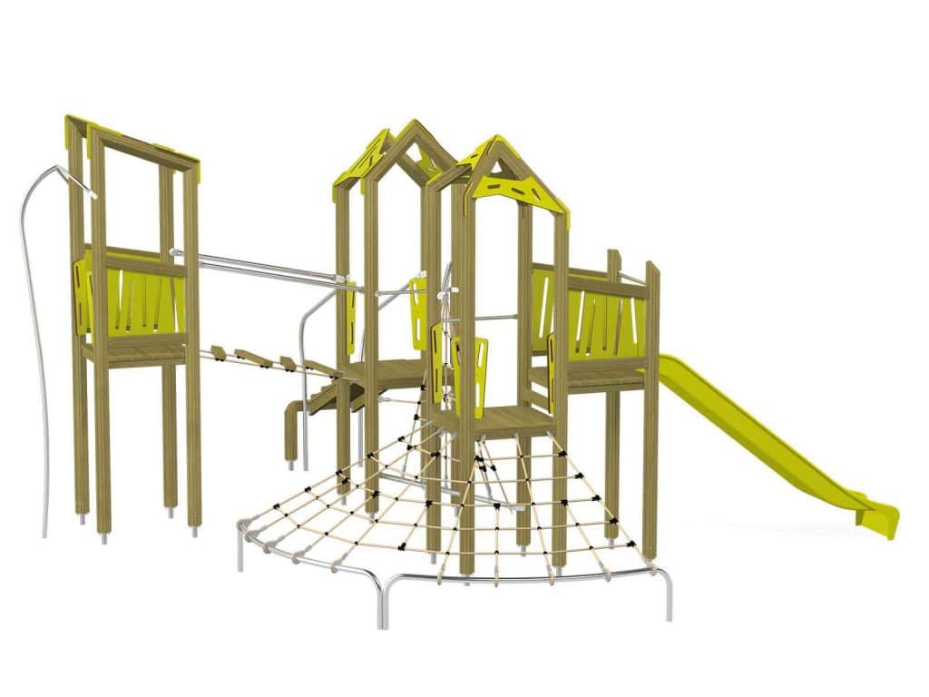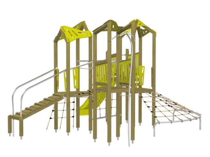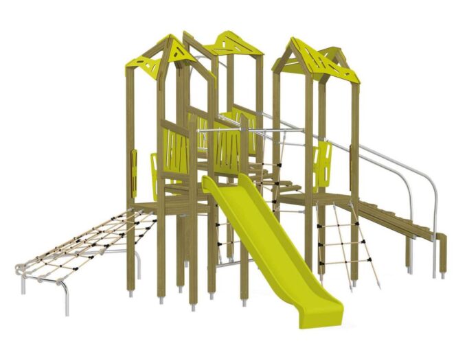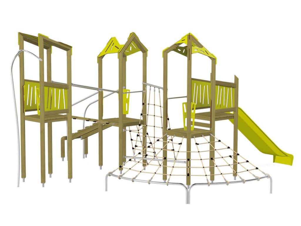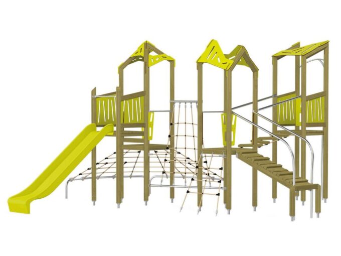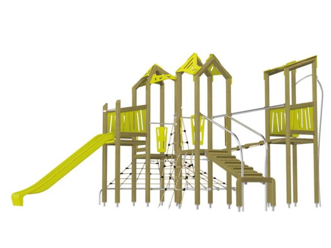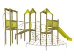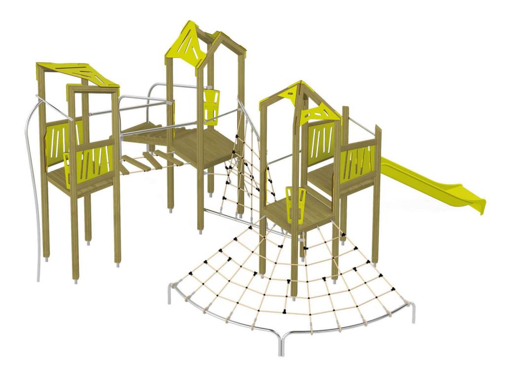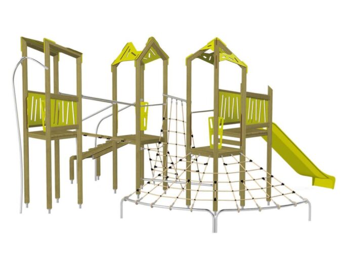 Die Spielturm-Anlage Triangulo 17402 besteht aus drei Spieltürmen mit Dach, einer Rutsche, einer Wackelbrücke, mehreren Kletternetzen, Kletterbrücke, einer Rutschstange und einer Einstiegsbrücke mit Metallhalterung. Das farbenfrohe Set macht jeden Kindergarten- oder Vorschulspielplatz attraktiver.