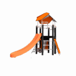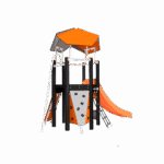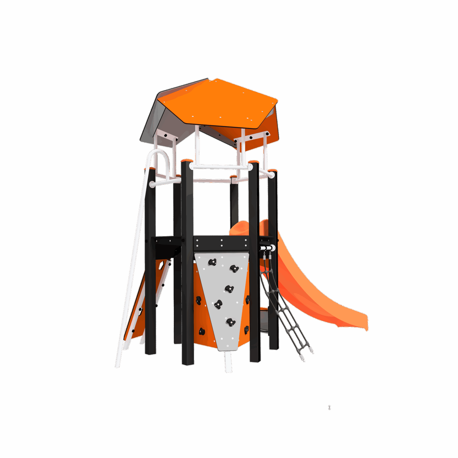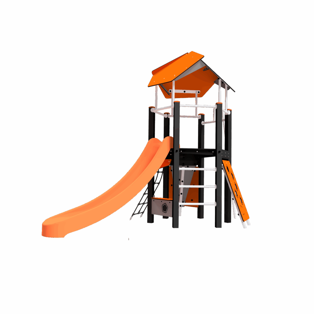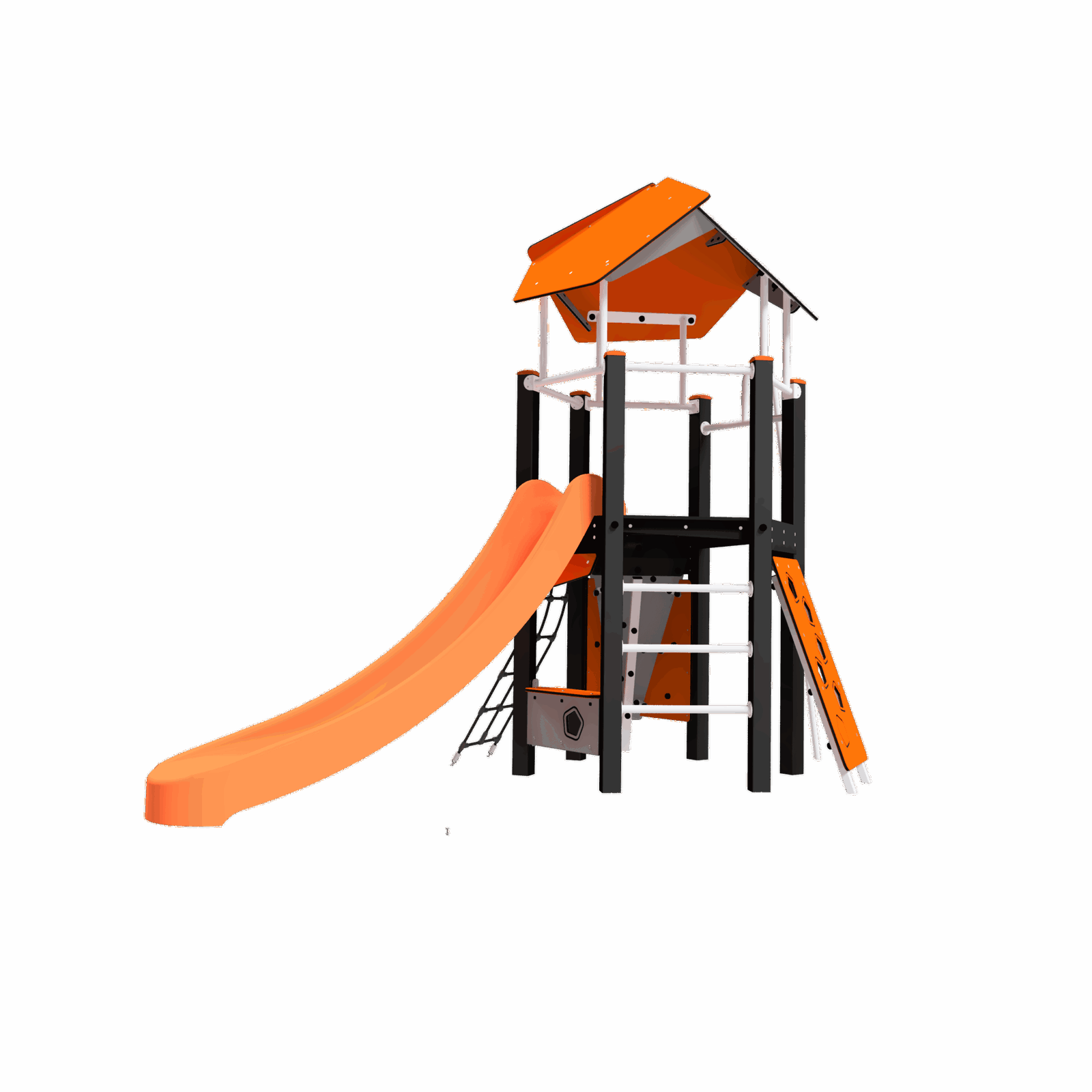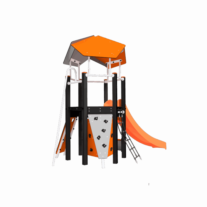 - Material: Die Pfosten bestehen aus pulverbeschichtetem Aluminium. Die Oberseite ist mit einer Kappe versehen. Die Podestböden bestehen vollständig aus recycelbarem Kunststoff und haben ein rutschfestes Profil. Die Brüstungen bestehen aus farbigen, 19mm starken, witterungsbeständigen HMPE-Platten. Rutsche ist aus farbigem, glasfaserverstärktem Polyester gefertigt. Alle Metallteile sind aus pulverbeschichtetem Aluminium, pulverbeschichtetem verzinktem Stahl oder Edelstahl. Verbindungen werden ggf. mit einer Kunststoffkappe versehen.