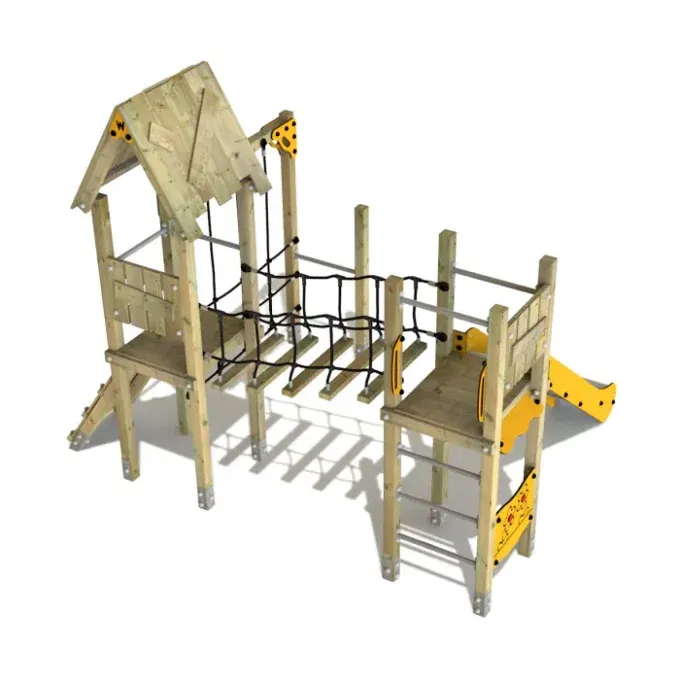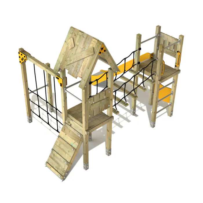 - Kletternetz aus verstärktem Seil und Wackelbrücke für spannende Kletterabenteuer.
