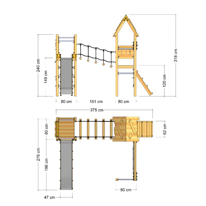 - Zwei Spielpodeste auf unterschiedlichen Höhen (120 cm und 149 cm) laden zu fröhlichem Klettern ein.