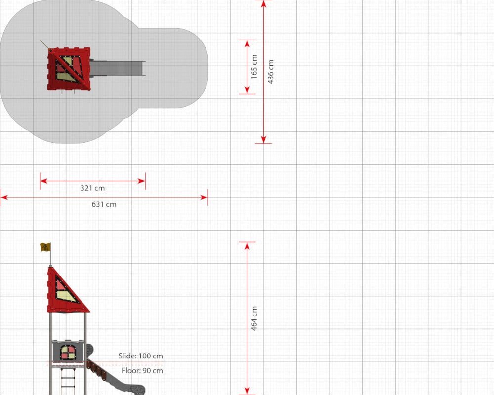 - Platzbedarf inkl. Sicherheitsabstände (LxB): 631 x 436 cm