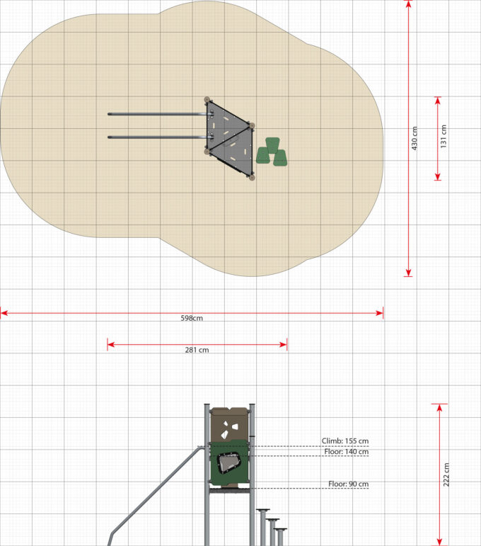 - Platzbedarf inkl. Sicherheitsabstände (LxB): 596 x 430 cm