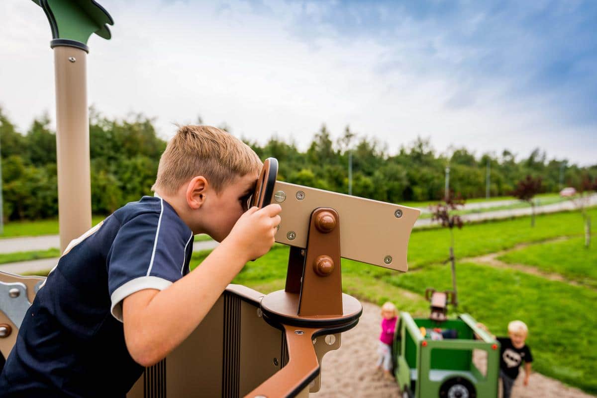 Die Plattform der Bona-Anlage kann über die rutschfesten Stufen betreten werden. Die Bodenhöhe beträgt 140 cm. Das Krähennest bietet einen eindrucksvollen Ausblick über den Spielplatz. Wo versteckt sich der beste Freund? Auch das Teleskop kann sich als nützlich erweisen, da es sich sowohl drehen als auch neigen lässt. Zurück zum Boden geht es rasant über die Rutsche, deren Rutschfläche aus Polyethylen besteht, das in der Sonne nicht überhitzt.